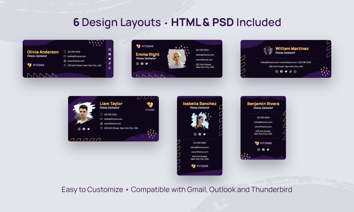 - Professional and stylish. You can choose from 6 different designs that suit your fitness and gym brand identity. Each design has a unique layout, color scheme, and font combination that will make your email signature stand out.