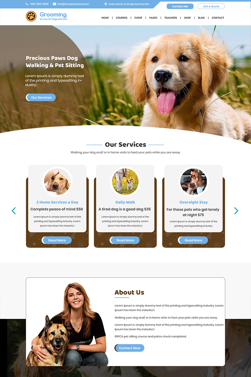 If you are looking for an ideal PSD template for the website of Dog Care, Grooming is the right choice for you. It is perfect for the website of Dog Care. Since it is 100% customizable so you can edit this template as per your choice. Here, you will find a number of shapes and all of these shapes are resizable and removable. You can convert it into HTML, WordPress and any other platform you like.