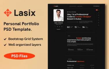 Lasix is a creative and unique CV/resume template for developer, designer, programmer, freelancer, writer, lawyer, musician, trainer, photographer or any other professions & Can be used for Personal Pages. This template contains a single page and also multiple pages with a clean & smooth design. Each element of this design is fully creative. The PSD files are fully customizable and all elements are in groups and can easily identify by the group name as well.