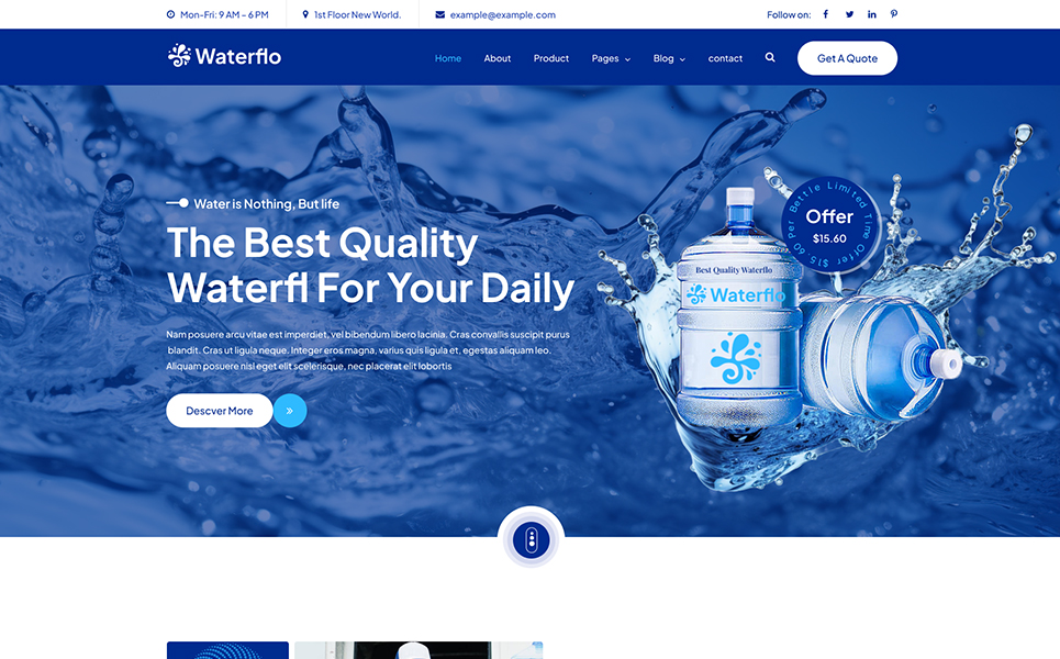 Waterflow is a sleek and modern Figma template designed specifically for drinking water delivery businesses. Whether you offer bottled water, filtration services, or subscription-based deliveries, this template provides a user-friendly interface to enhance customer engagement and streamline ordering.