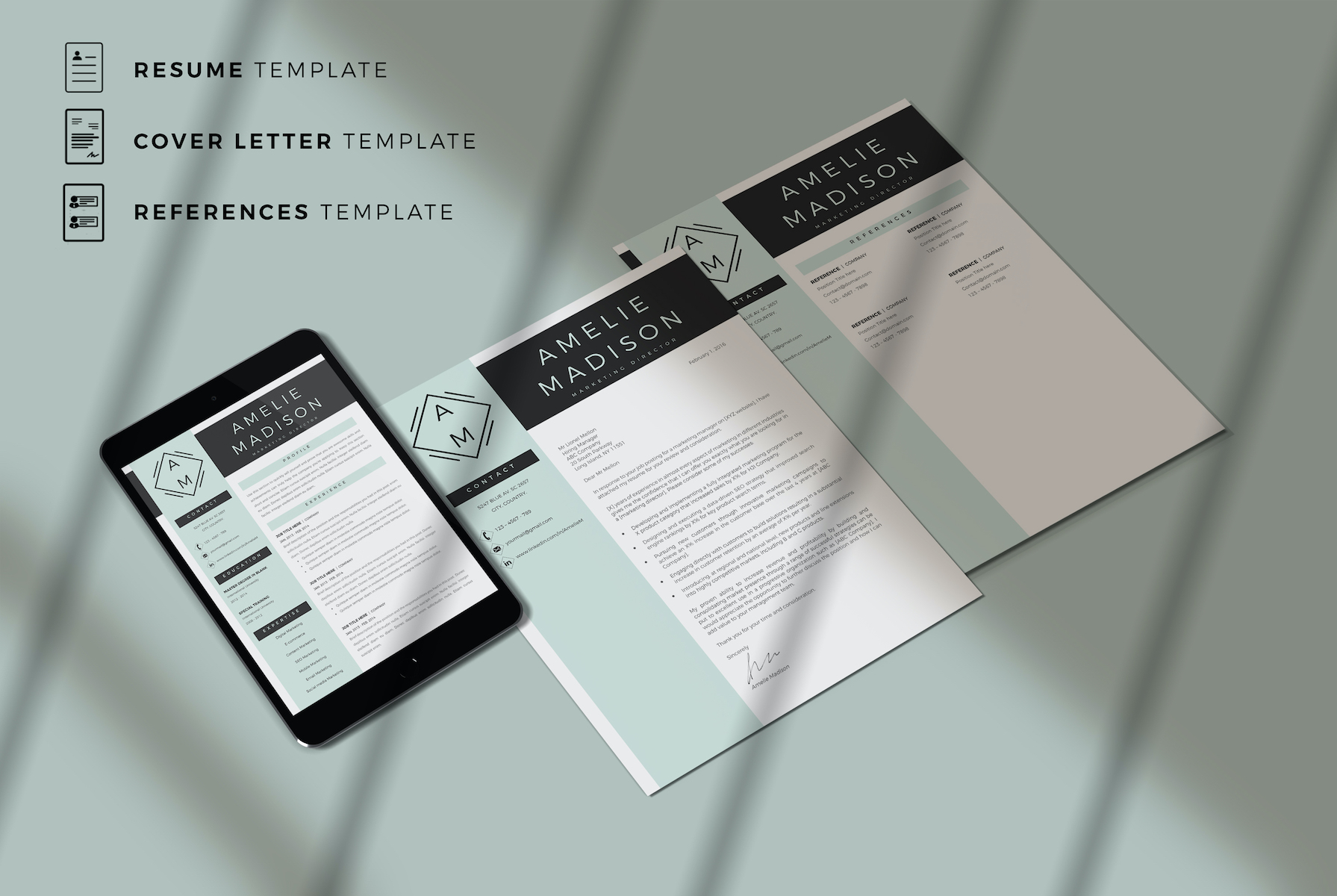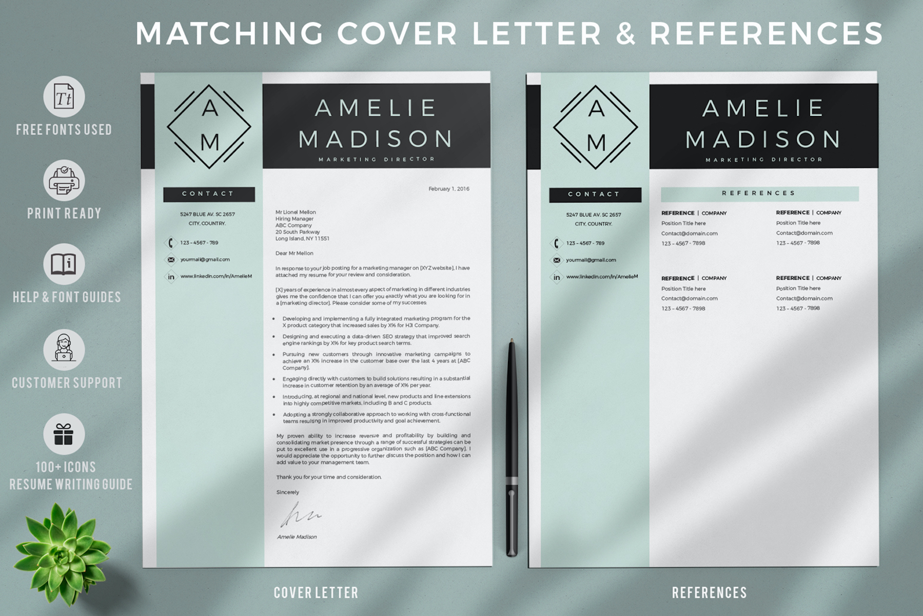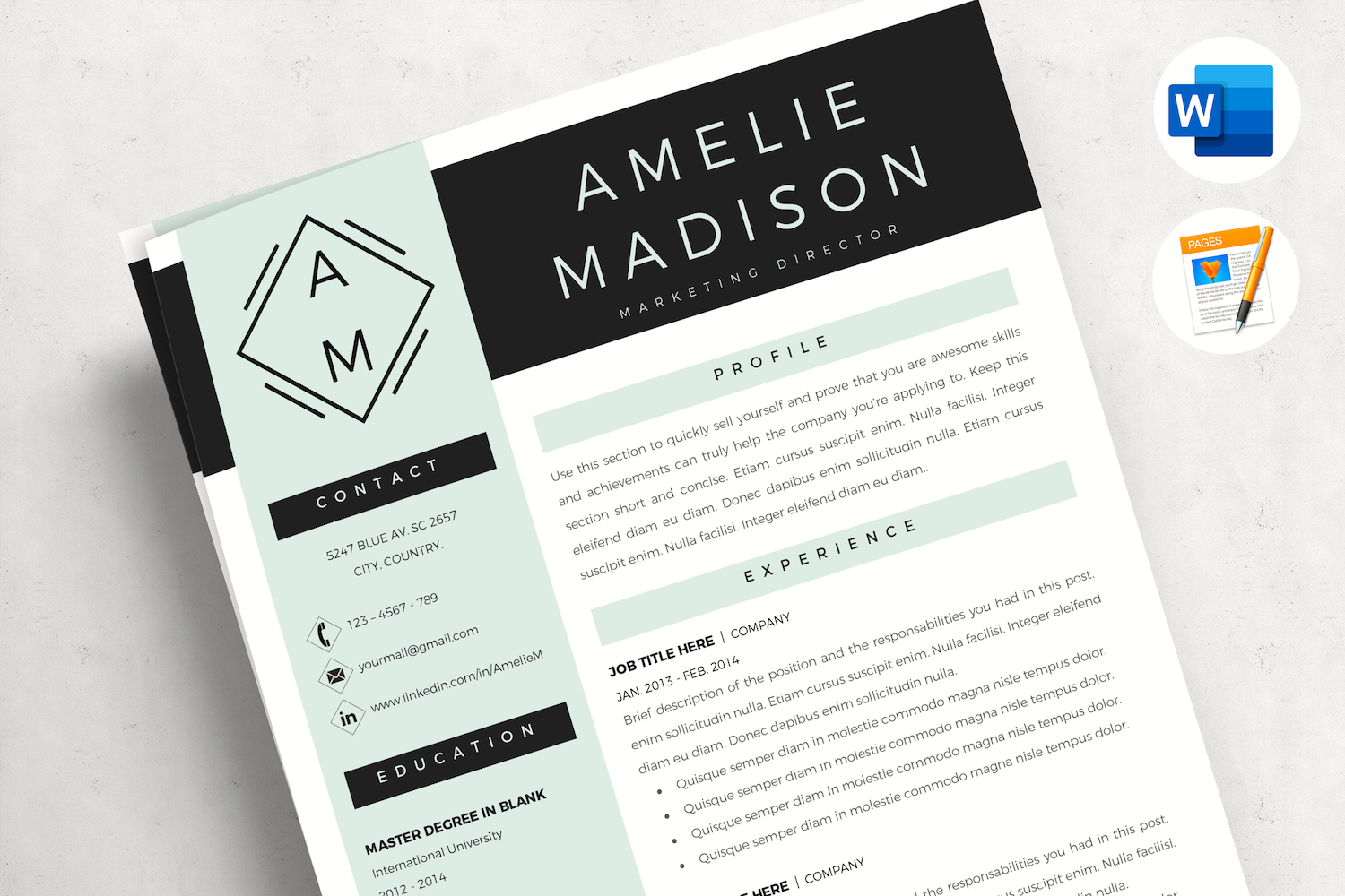 AMELIE - Marketing Resume Template for Word & Pages. CV with Logo, Cover Letter & References