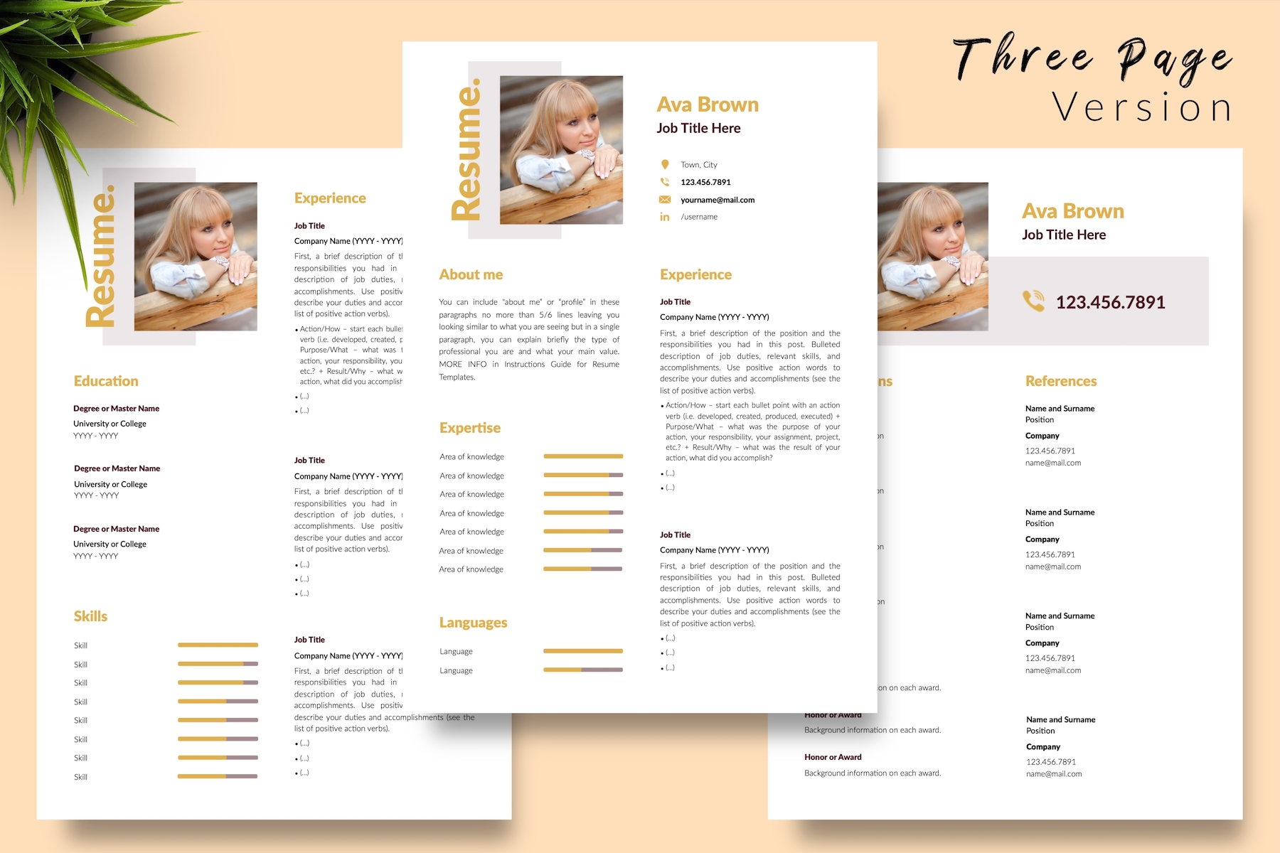 Resume/CV Template for Microsoft Word & iWork Pages that includes US Letter Size Files and A4 Size Files; Microsoft Word Files (.docx) and iWork Pages Files (.pages); 1, 2, and 3 Page Resume Version, Cover Letter Template, References Letter Template, and Cover Letter with References Letter Template. In addition, it includes Free Fonts Used (SIL Open Font), Social Icons Pack, Resume Writing Guide for Resume Building (Free Bonus), and Self-Knowledge and Development Questionnaire (Free Bonus).