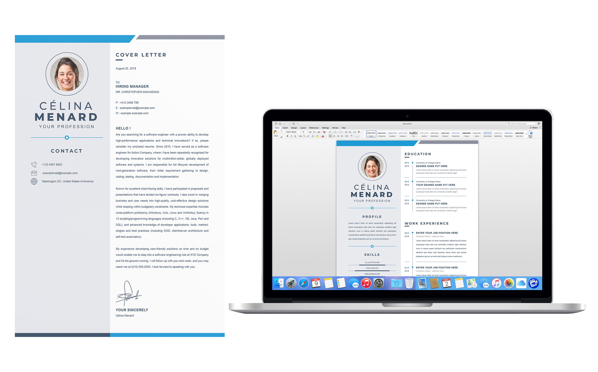 - Open the template in Word, Pages, Photoshop, Illustrator, or InDesign and replace my “dummy” text with your resume content