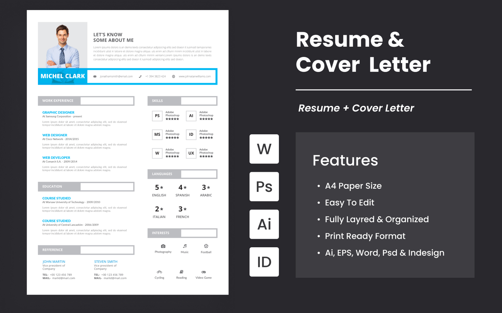 This is Professional Resume & Cover Letter template . This template download contains 300 dpi print-ready CMYK files. All main elements are editable and customizable.