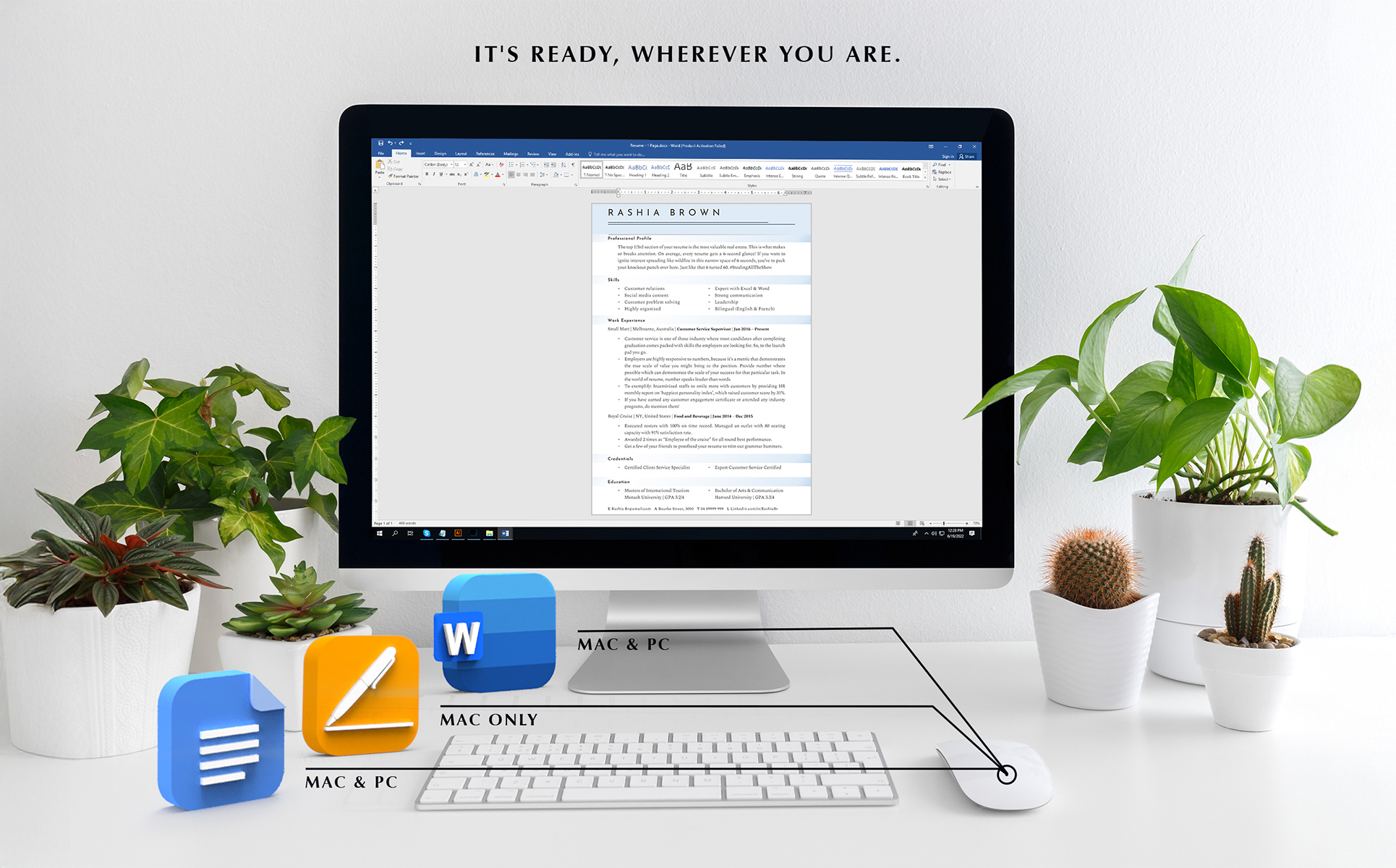 This sleek, modern template works seamlessly with Microsoft Word (2016+ desktop only), Mac Pages, and Google Docs, giving you the flexibility to build your resume your way.