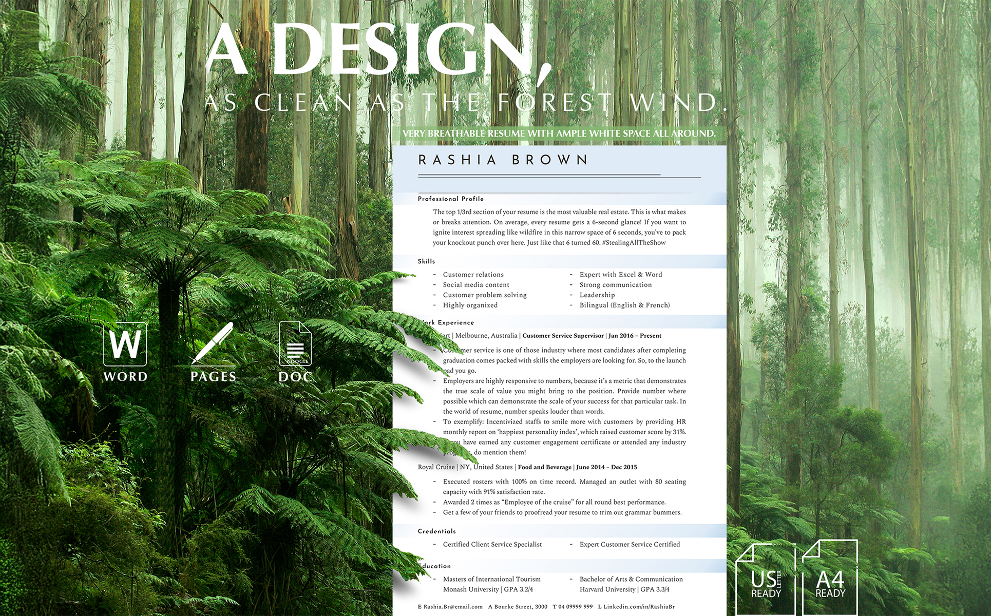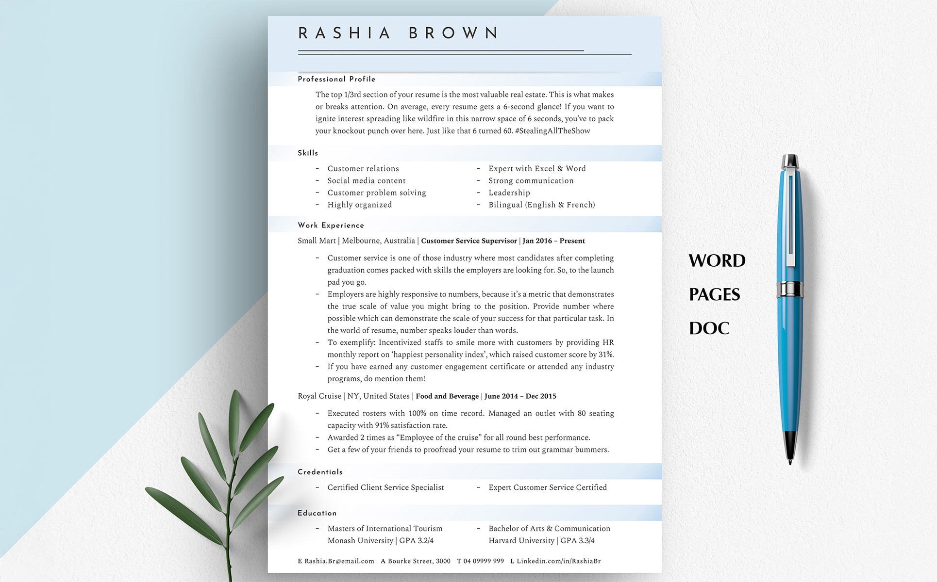 Customer Service Resume Template – Word, Google Docs Resume, Mac Pages CV, Minimalist Word Template