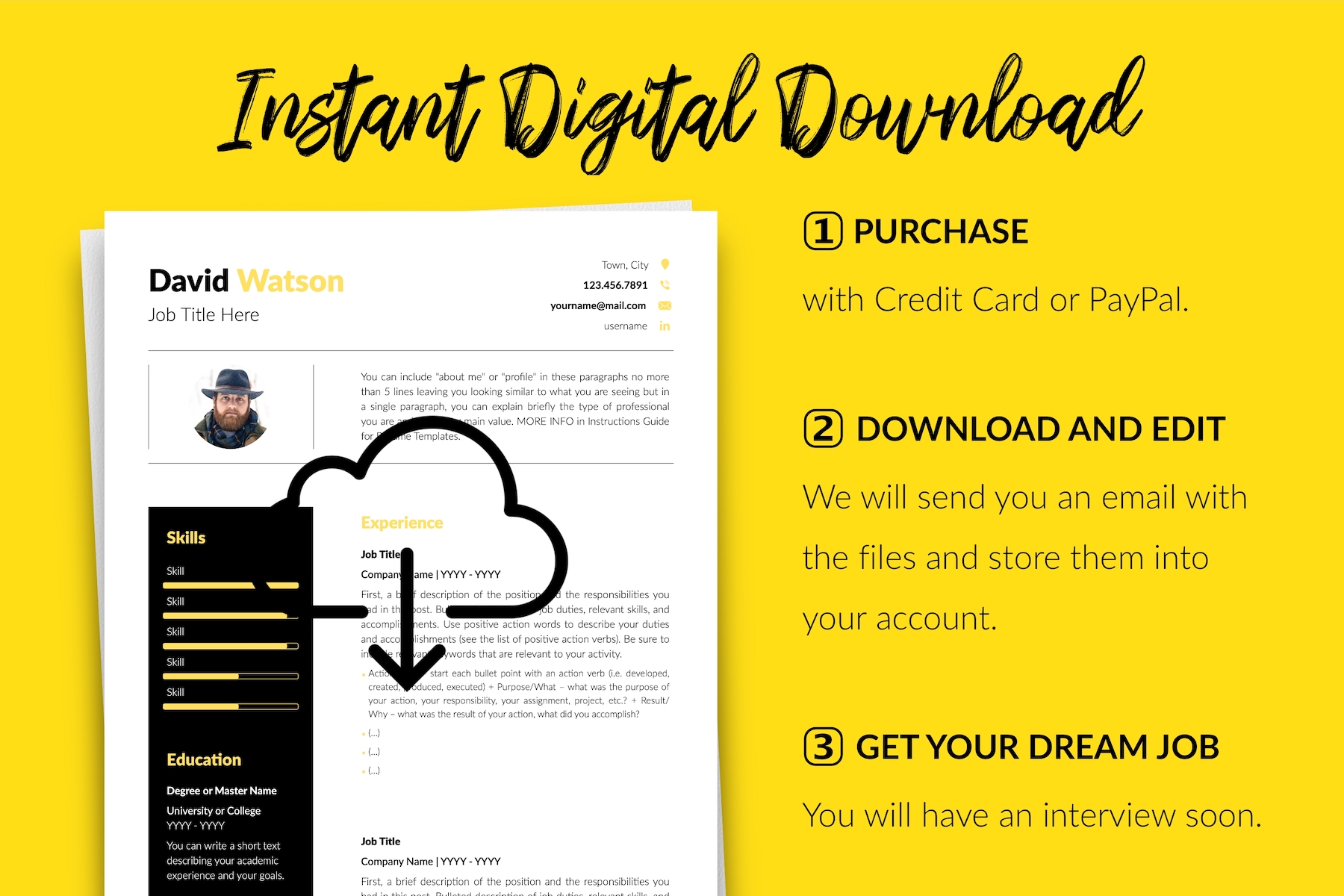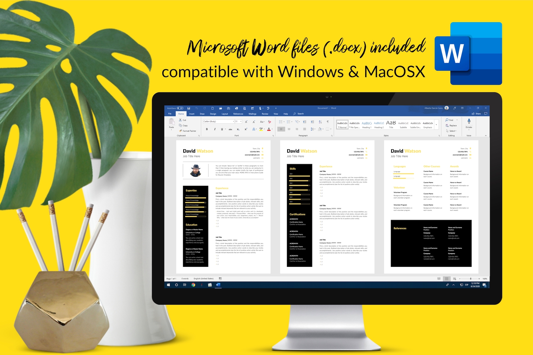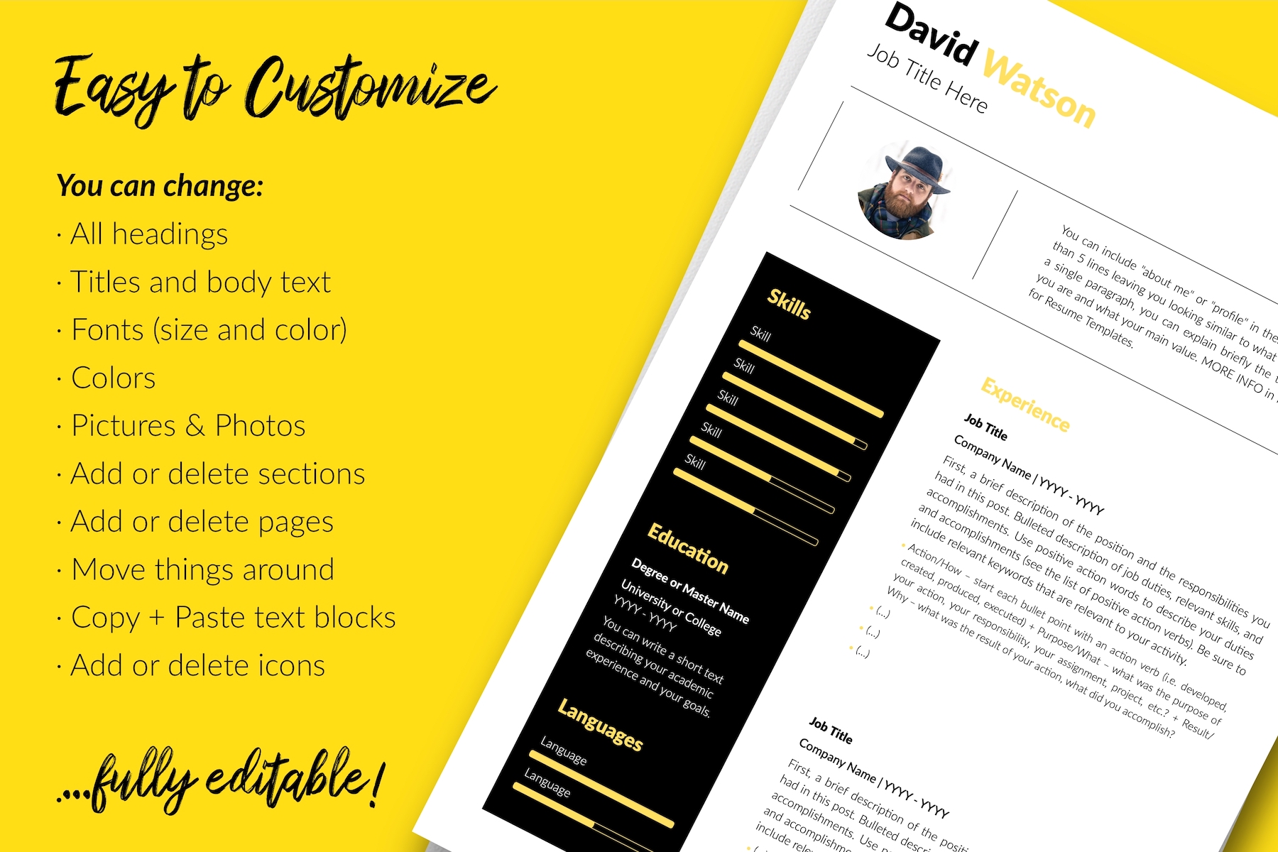 Templates are fully editable 100%. Easy to edit/customize resume templates with Microsoft Word for Windows and MacOS (.docx) and iWork Pages for MacOS (.pages). Each element on the resume template has been designed in separate text boxes so that it can be easily moved, copied, or removed. Simply click on the text and start typing over my draft text. Templates are do-it-yourself. You can change: