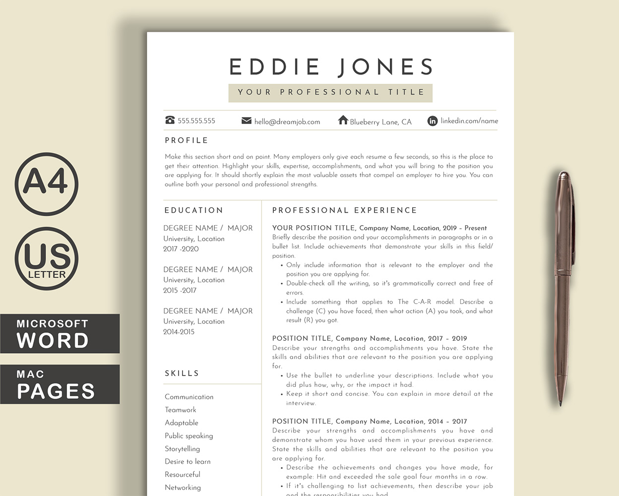 • Use for ANY profession since all text can be changed in Word or Pages.