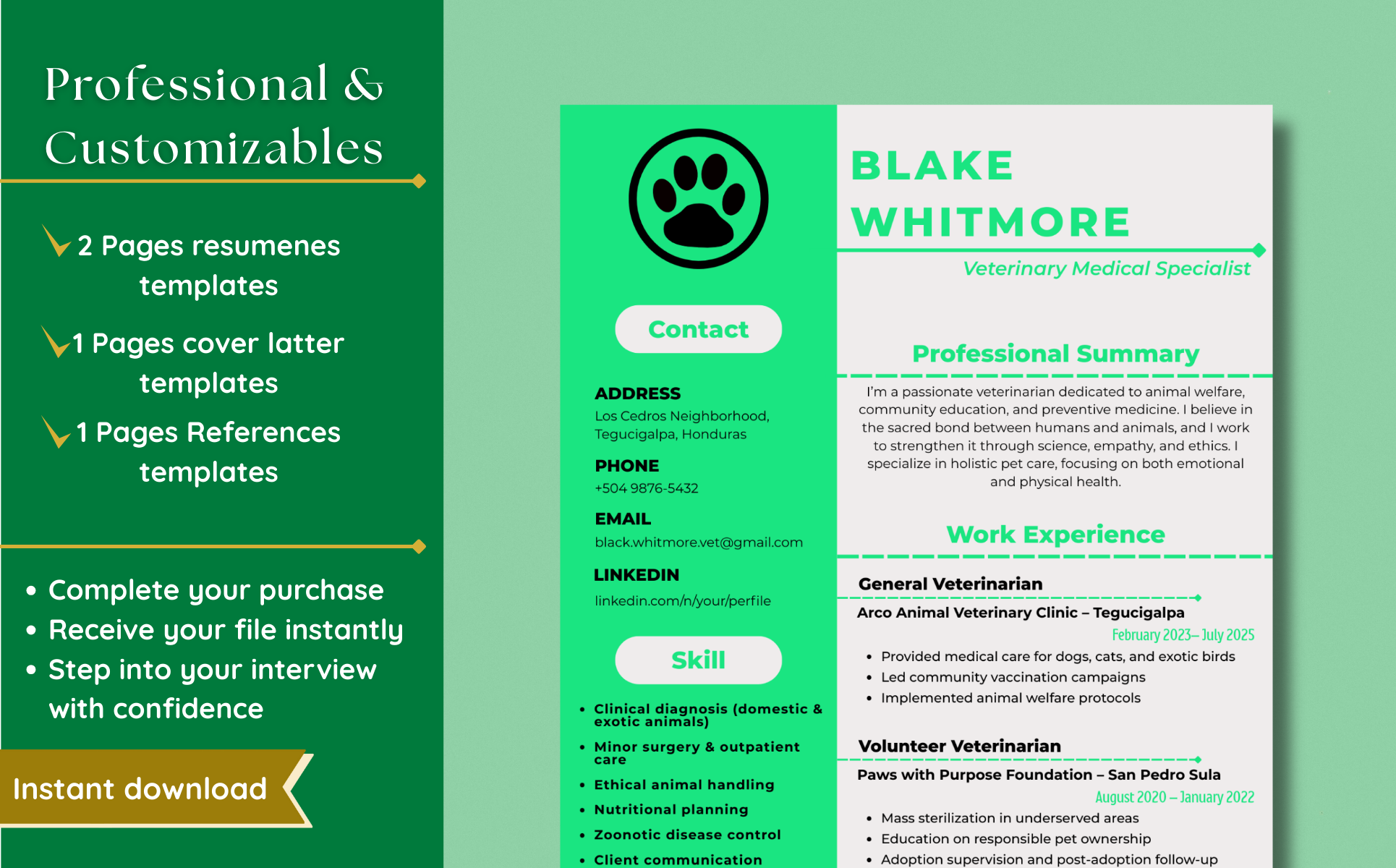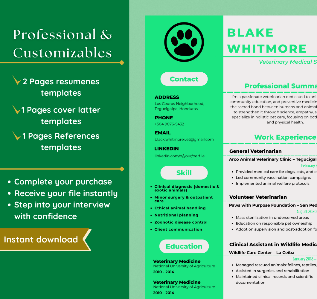 Showcase your veterinary experience with this clean, modern, and fully editable resume template designed specifically for animal care professionals. Whether you're applying to clinics, research institutions, or academic programs, this kit helps you present your expertise with confidence and elegance.