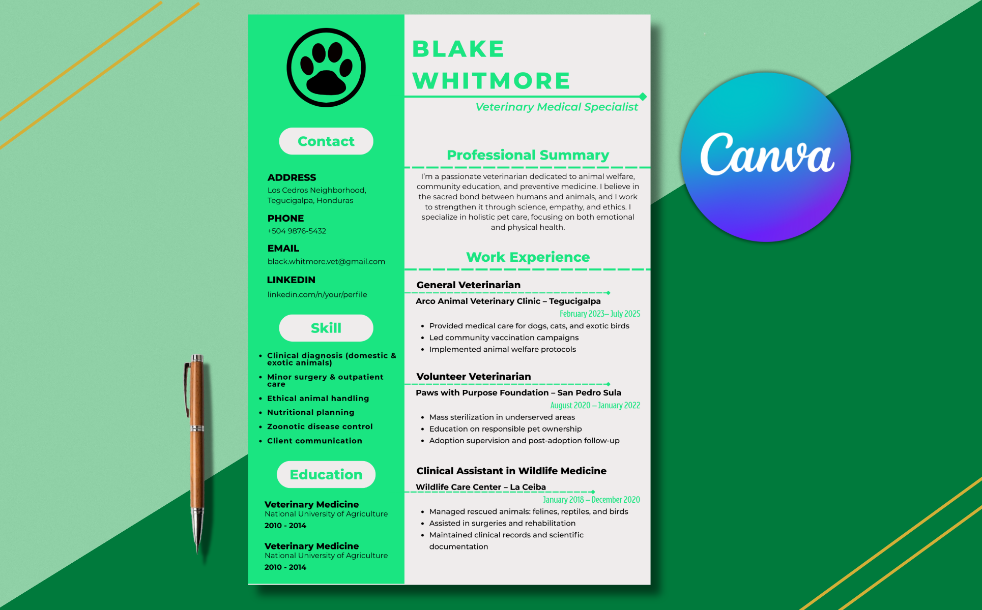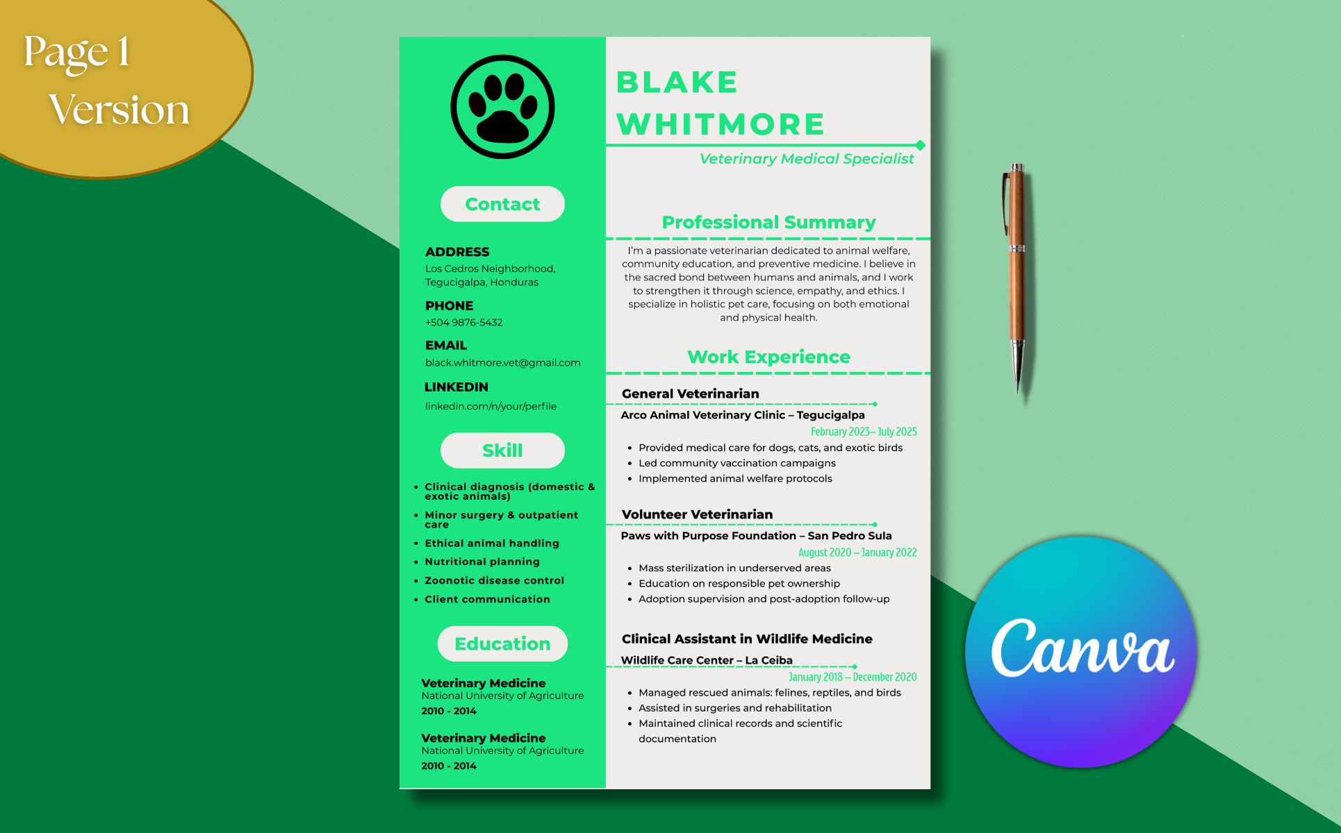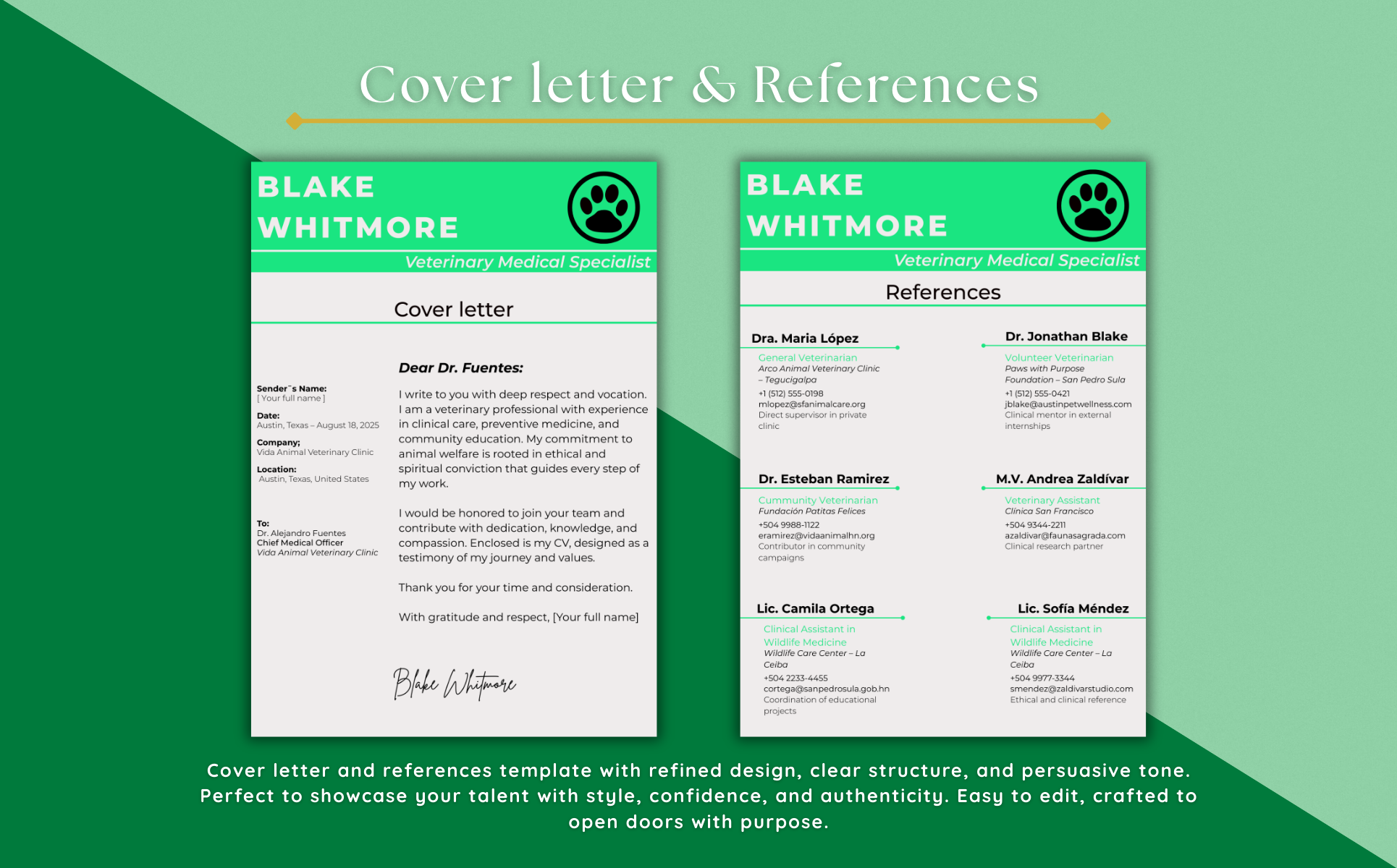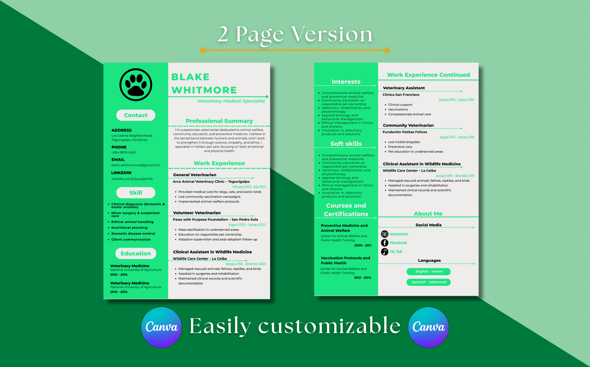 Editable Veterinary Resume Template for Canva + Cover Letter & Recommendation
