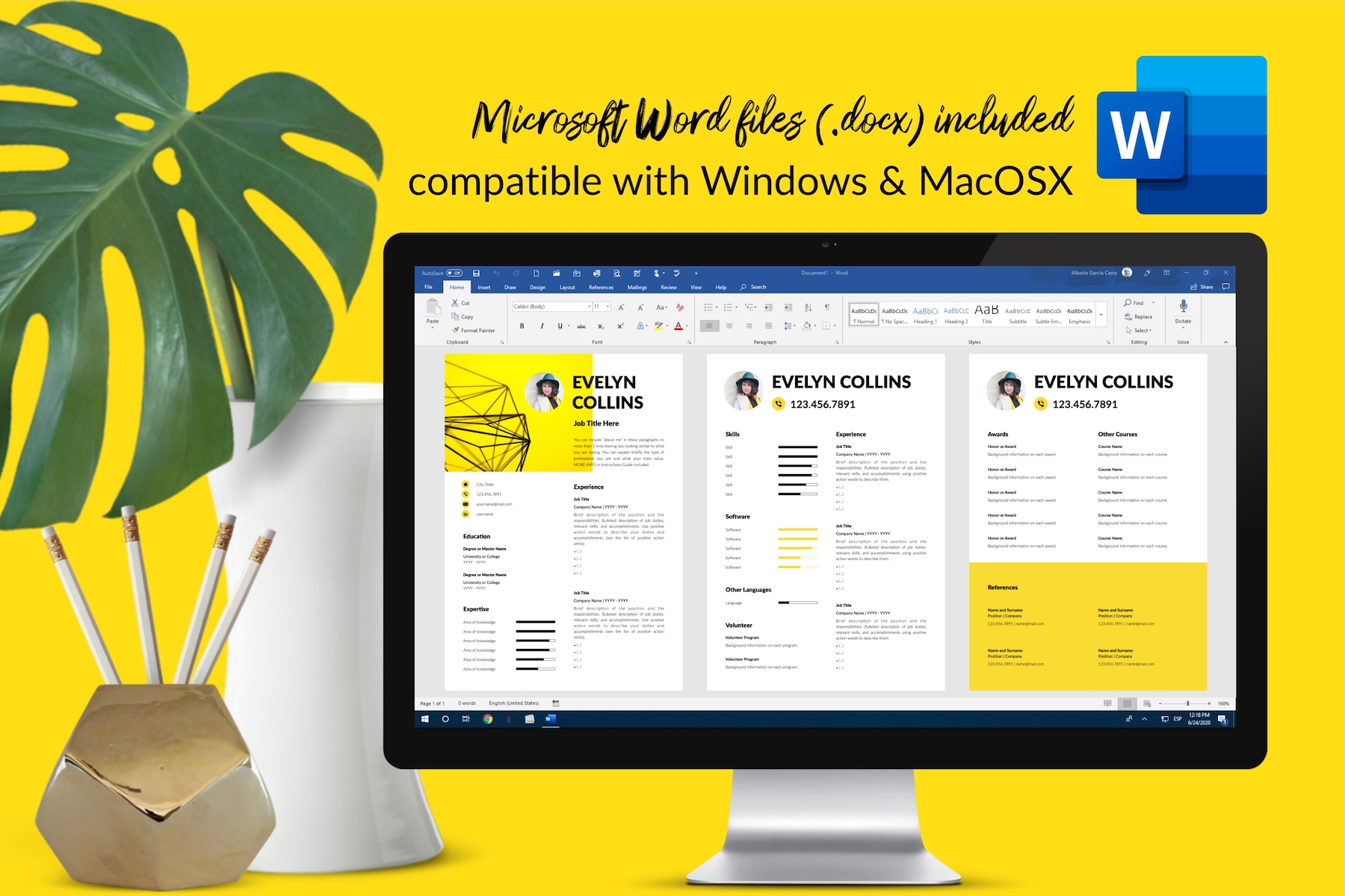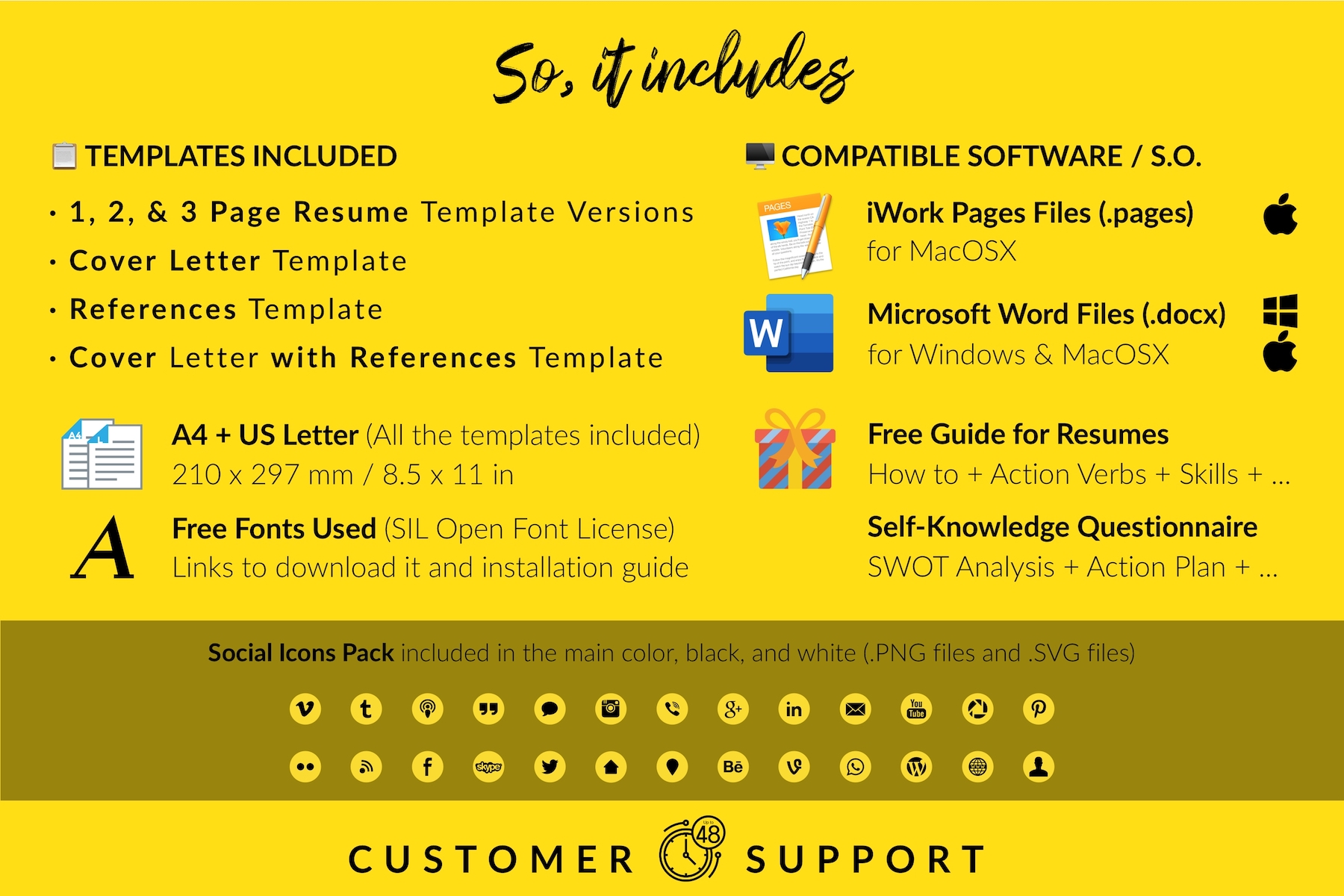 Resume/CV Template for Microsoft Word & iWork Pages that includes US Letter Size Files and A4 Size Files; Microsoft Word Files (.docx) and iWork Pages Files (.pages); 1, 2, and 3 Page Resume Version, Cover Letter Template, References Letter Template, and Cover Letter with References Letter Template. In addition, it includes Free Fonts Used (SIL Open Font), Social Icons Pack, Resume Writing Guide for Resume Building (Free Bonus), and Self-Knowledge and Development Questionnaire (Free Bonus).