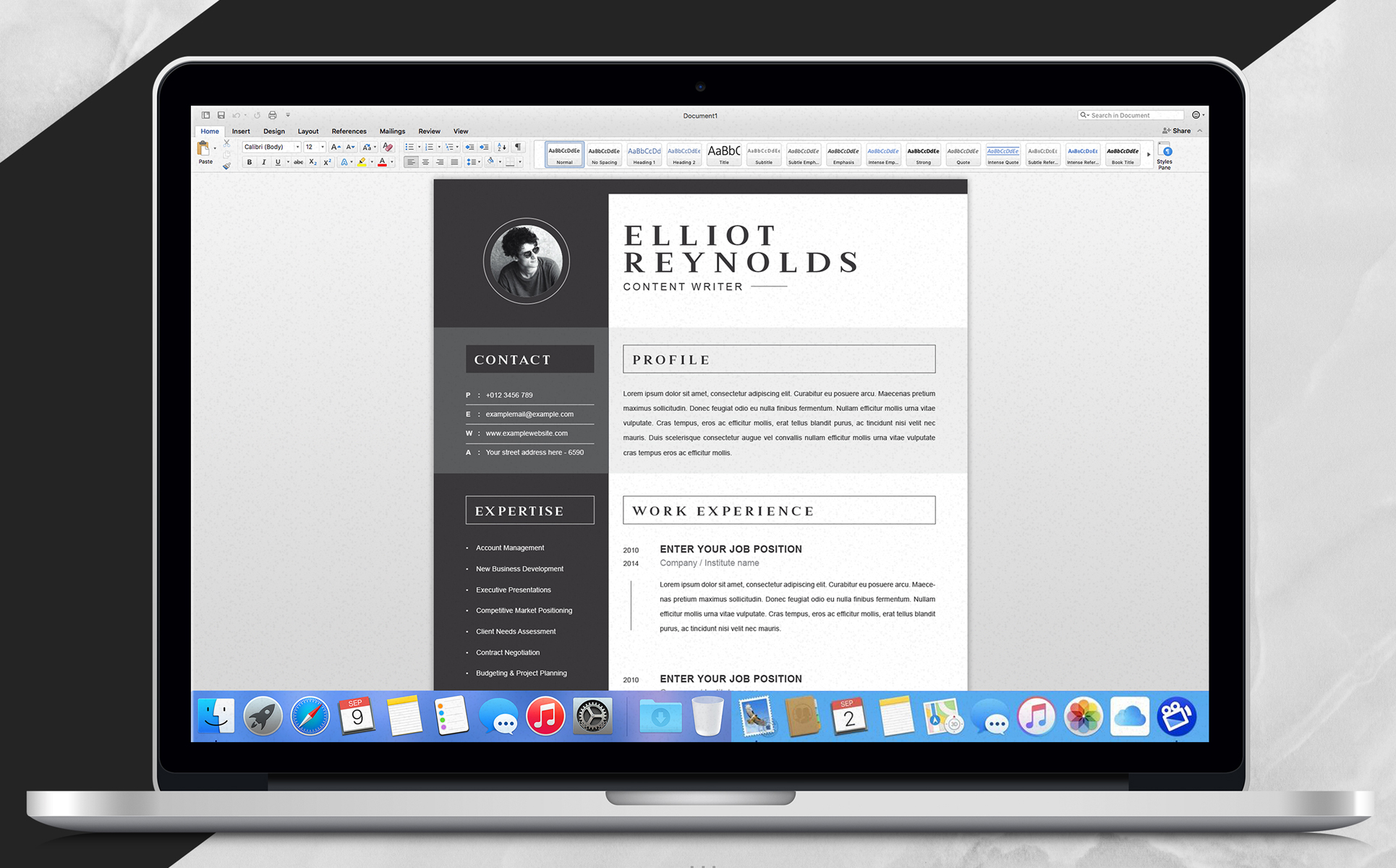 - Open the template in **Word, Pages, Photoshop, or Illustrator** and replace my "dummy" text with your resume content