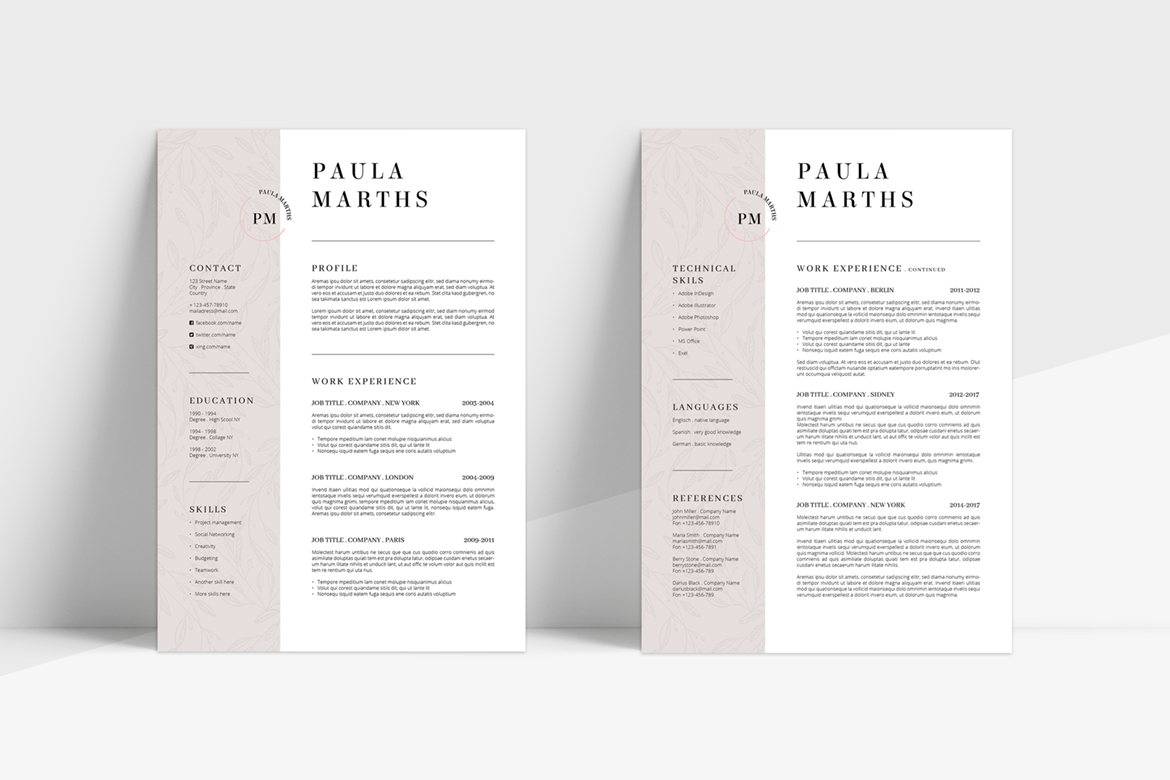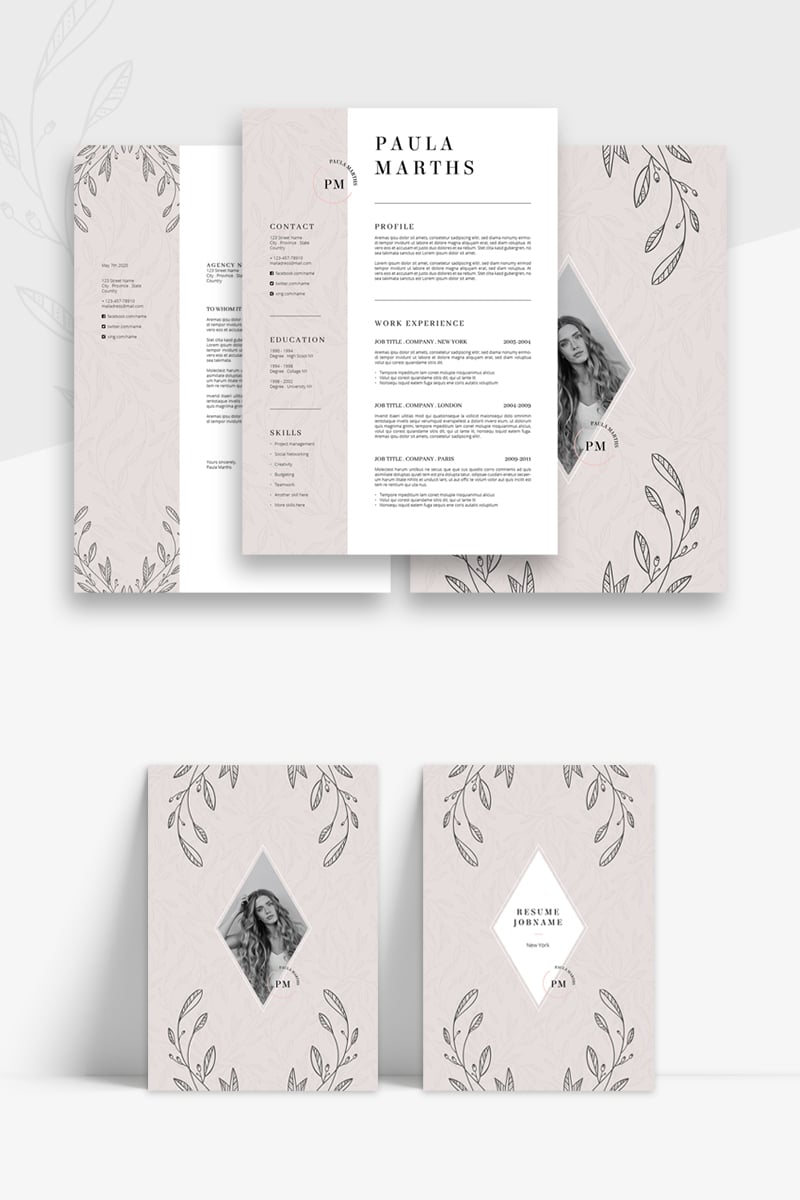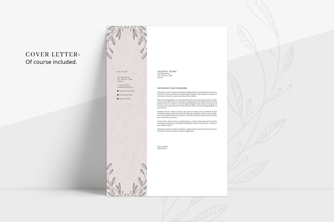 FLORAL resume comes with 5 pages: title (2 versions) + cover letter + 2 resume pages. These resume really stands out, so convince at the first sight and get your dream job.