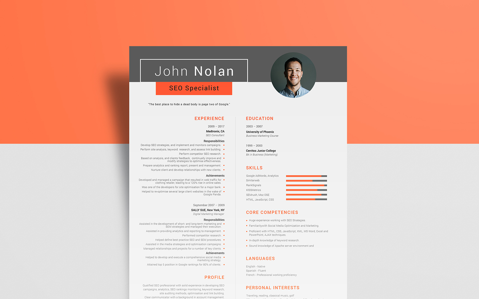 John Nolan is a free SEO resume template for people who want to impress a future employer with your resume's style and structure. This CV model is specifically created for Search Engine Optimization specialists to serve all their needs and present all the employee information in the structural and laconic way. The file formats include PDF and DOCX that much simplifies the adaptation process to your needs. Also, it is easily editable. All you need is to fill in the personal information about your skills, work experience.
