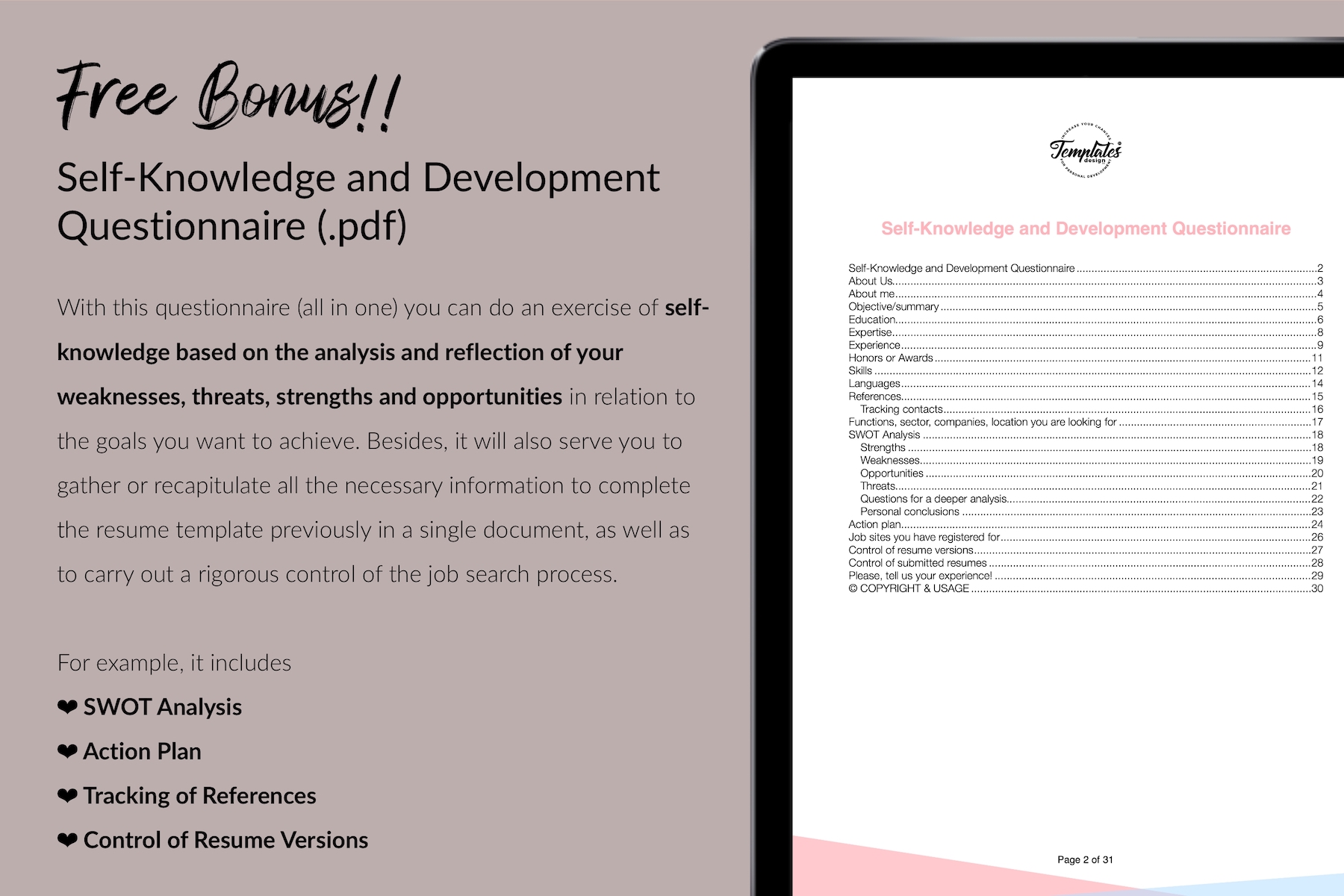- Self-Knowledge and Development Questionnaire (free) in PDF. With this questionnaire (all in one) you can do an exercise of self-knowledge based on the analysis and reflection of your weaknesses, threats, strengths, and opportunities in relation to the goals you want to achieve. Besides, it will also serve you to gather or recapitulate all the necessary information to complete the resume template previously in a single document, as well as to carry out a rigorous control of the job search process.