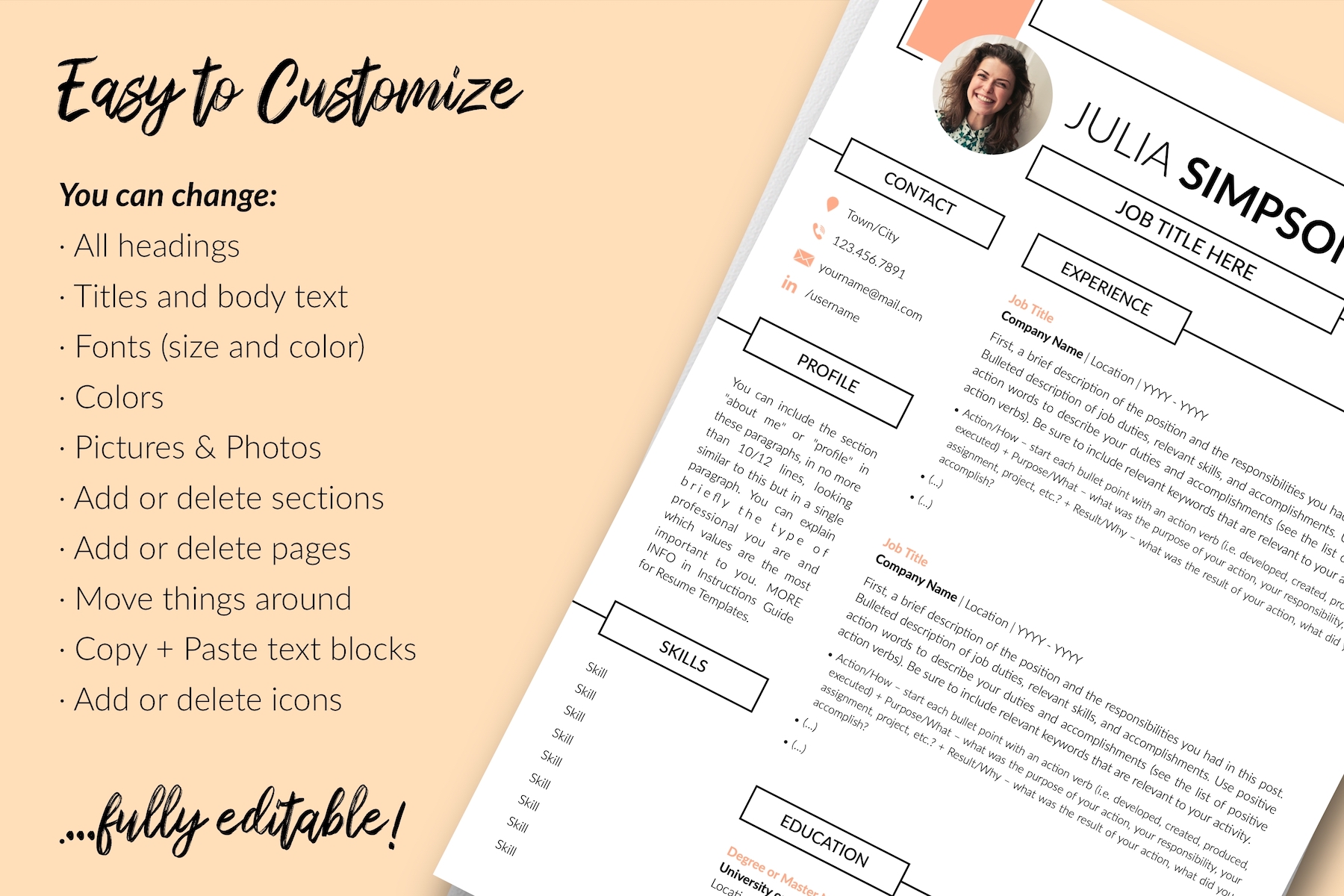 Templates are fully editable 100%. Easy to edit/customize resume templates with Microsoft Word for Windows and MacOS (.docx) and iWork Pages for MacOS (.pages). Each element on the resume template has been designed in separate text boxes so that it can be easily moved, copied, or removed. Simply click on the text and start typing over my draft text. Templates are do-it-yourself. You can change:
