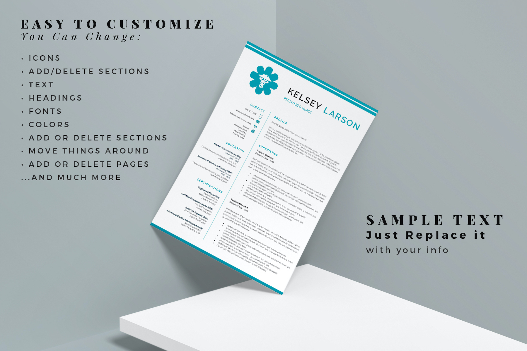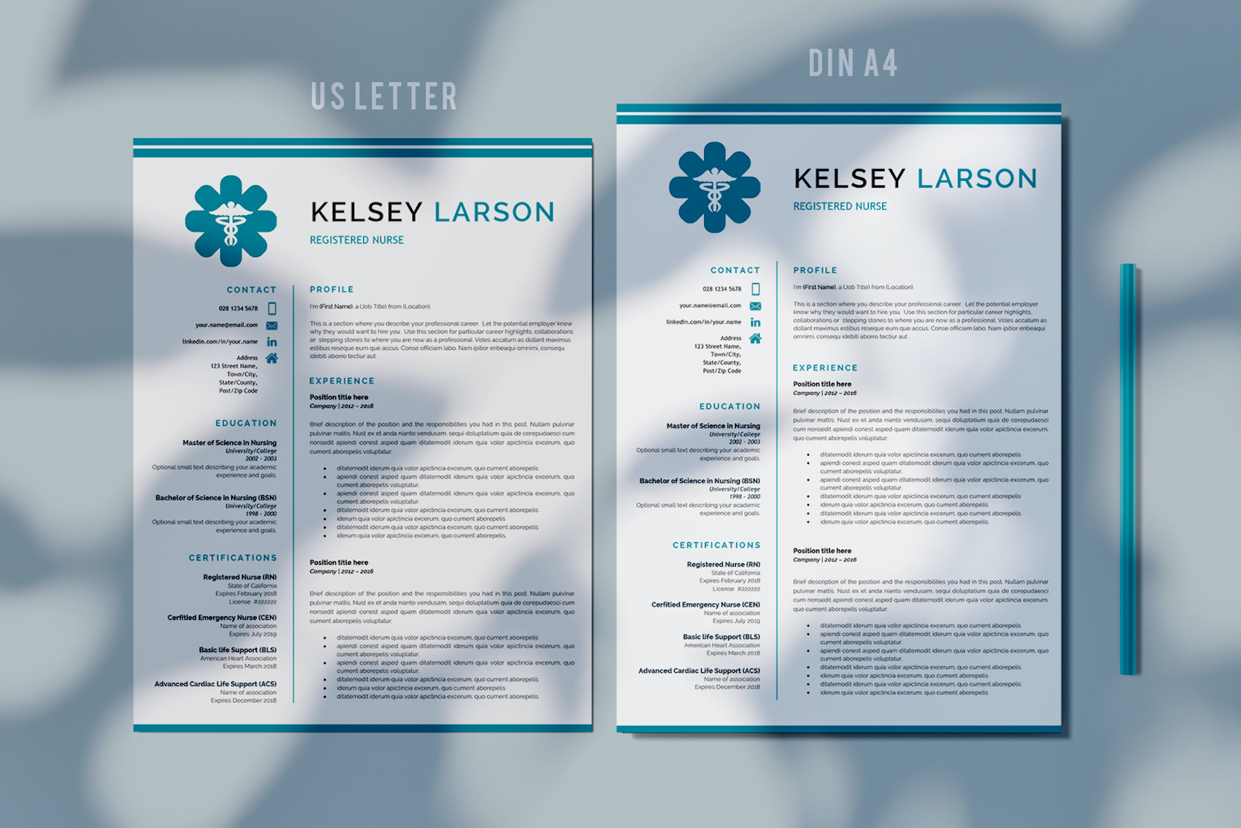 DESIGNED FOR our customers in the medical sector. Perfect design with caduceus for Registered Nurses, Labor Delivery nurses, Doctors, nurse practitioners, nurse aide resume, current students looking for side jobs or new graduates. It is also a great Resume Layout for a Certified Pharmacy, lab technician, pharmacy grad, pharmacy technician, or pharmacy student.