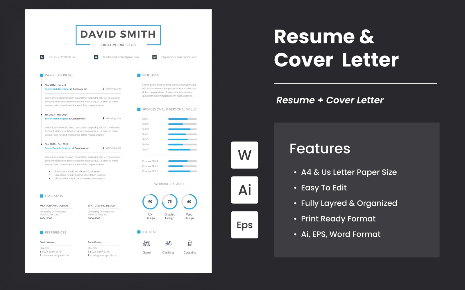 This is Resume & Cover Letter template . This template download contains 300 dpi print-ready CMYK files. All main elements are editable and customizable.