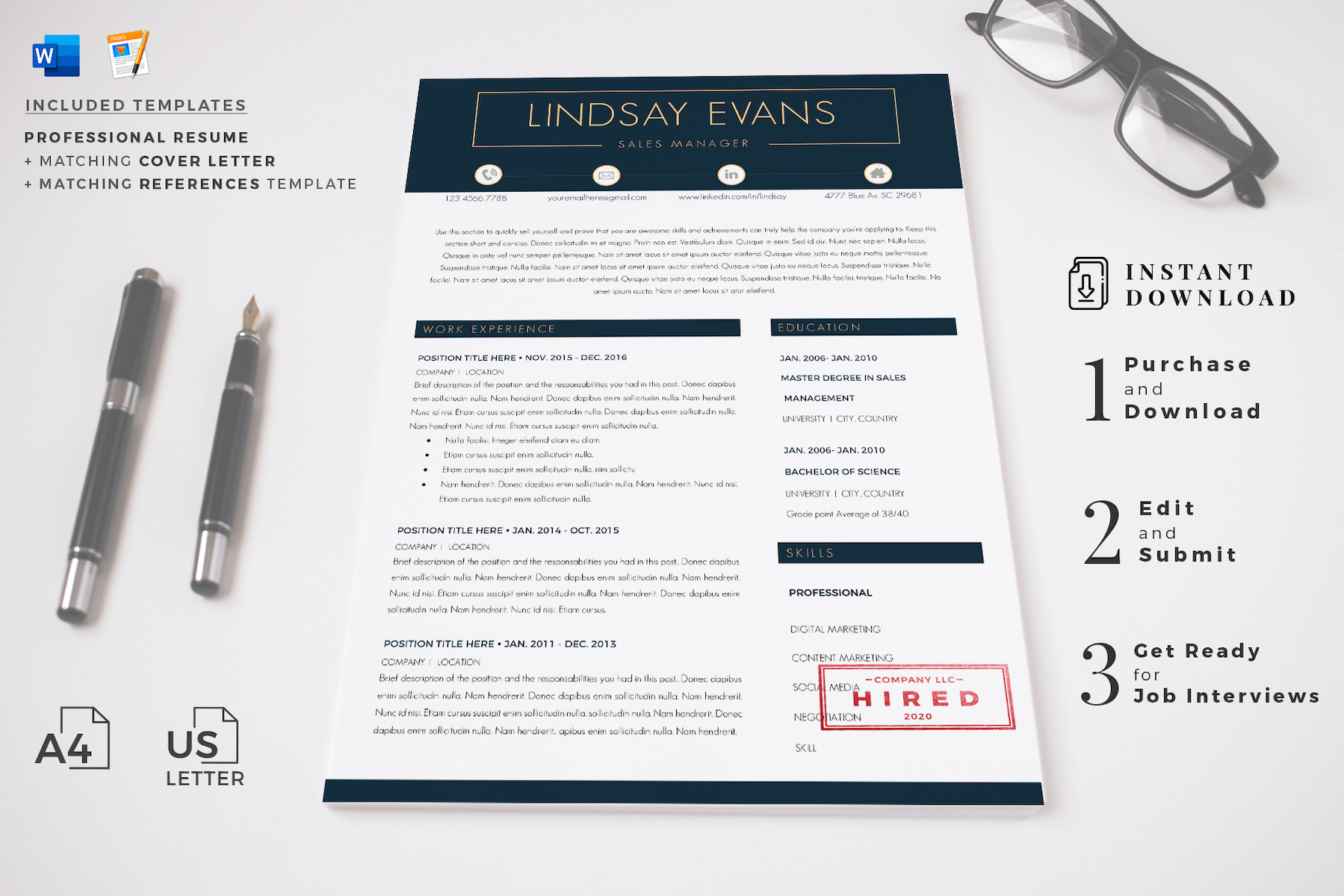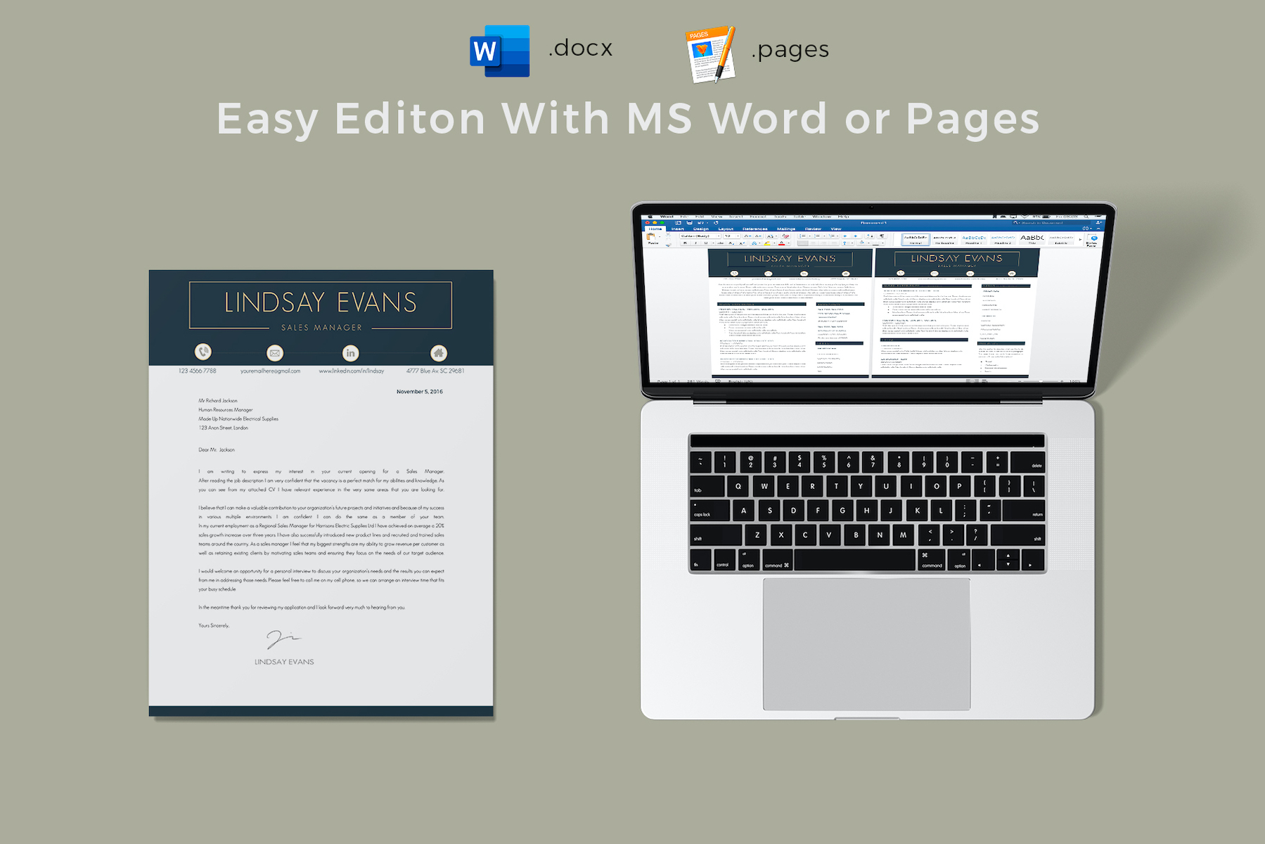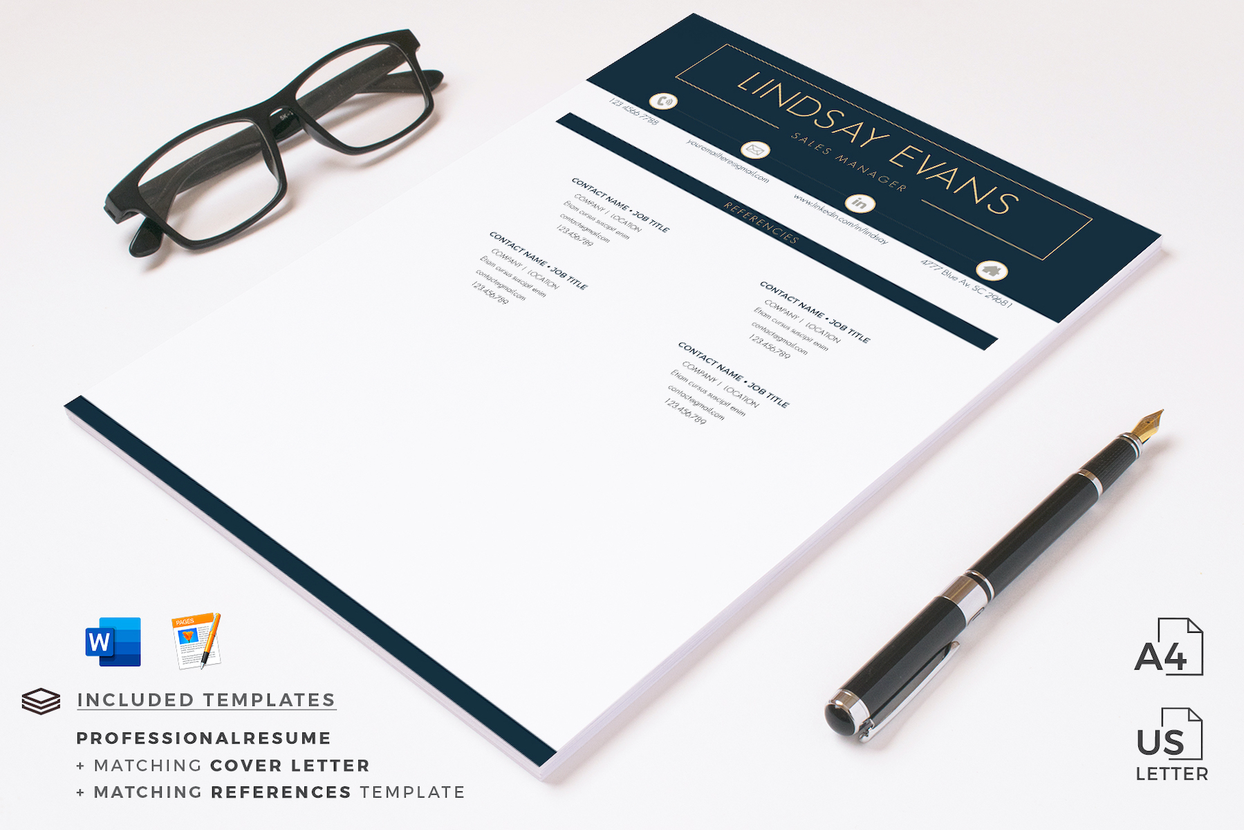 LINDSAY - Sales Manager Professional Resume, CV template + Cover Letter template + References Page