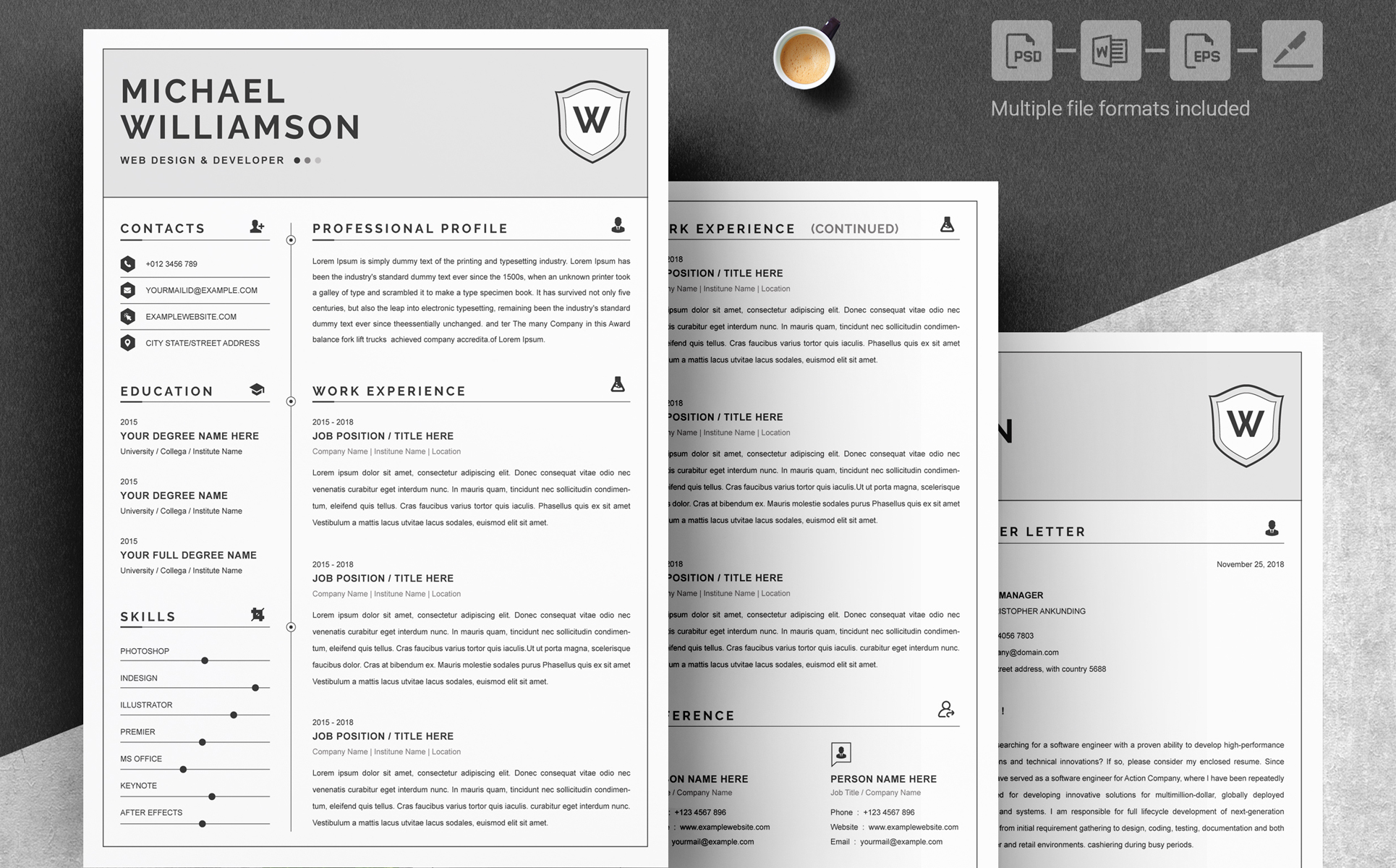 A template is simply multiple file-formats Microsoft Word document (or Mac Pages document, Photoshop (PSD) Illustrator (EPS) that is formatted using "text boxes" filled with my "dummy" information that you will type directly over with your own resume info. A quick text box tutorial is included in the Instructions file, included with purchase.
