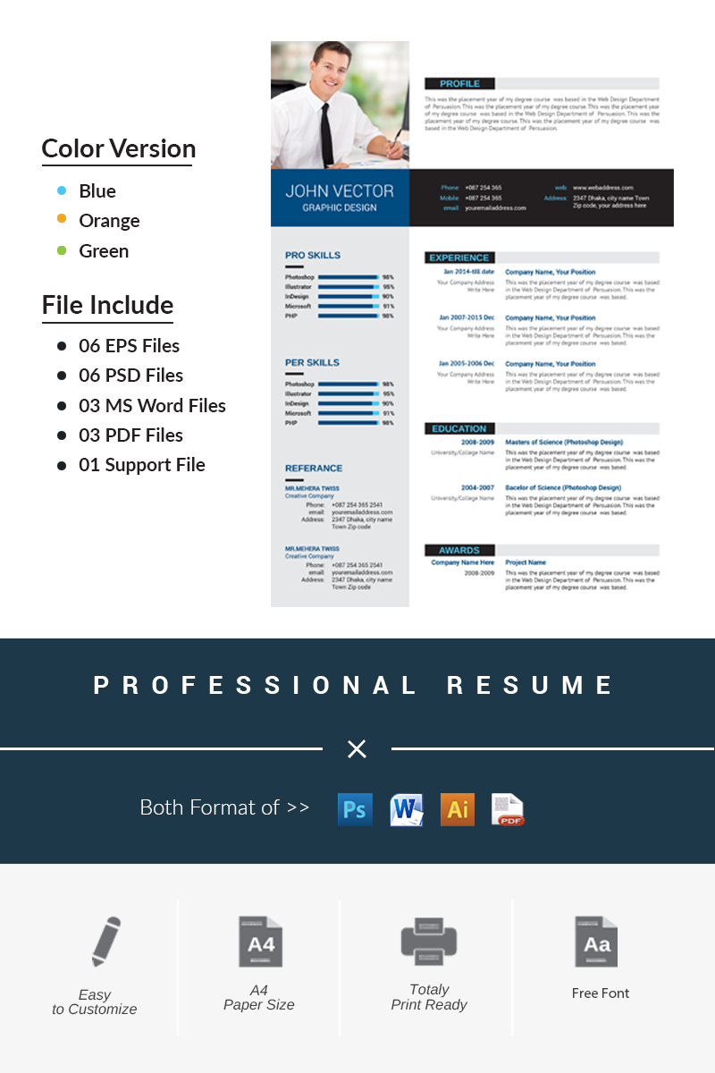 Make a positive impression with this simple and clean 3 color resume template. With a strong emphasis in typography, this template will present your information concisely in a layout that is pleasing to the eye and easy to read.