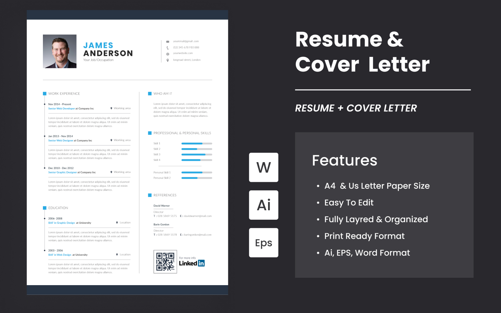 This is Resume & Cover Letter template . This template download contains 300 dpi print-ready CMYK files. All main elements are editable and customizable.
