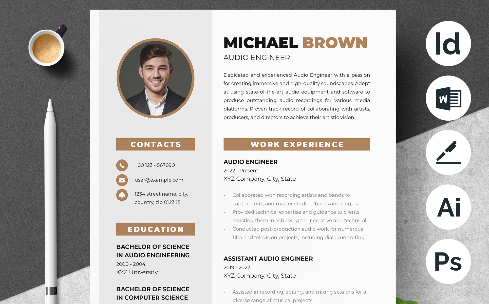 A template is simply multiple file formats Microsoft Word document (or Mac Pages document, Photoshop (PSD) Illustrator (EPS) that is formatted using "text boxes" filled with my "dummy" information that you will type directly over with your resume info. A quick text box tutorial is included in the Instructions file, included with the purchase.