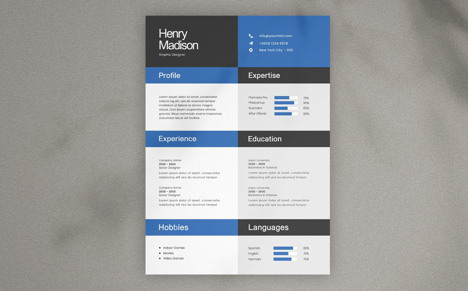 Make a clean and professional impression with this easy-to-edit Photoshop resume template. Its minimal design, clear layout, and simple structure make it perfect for any job seeker. Fully customizable, change text, colors, and fonts to match your style.