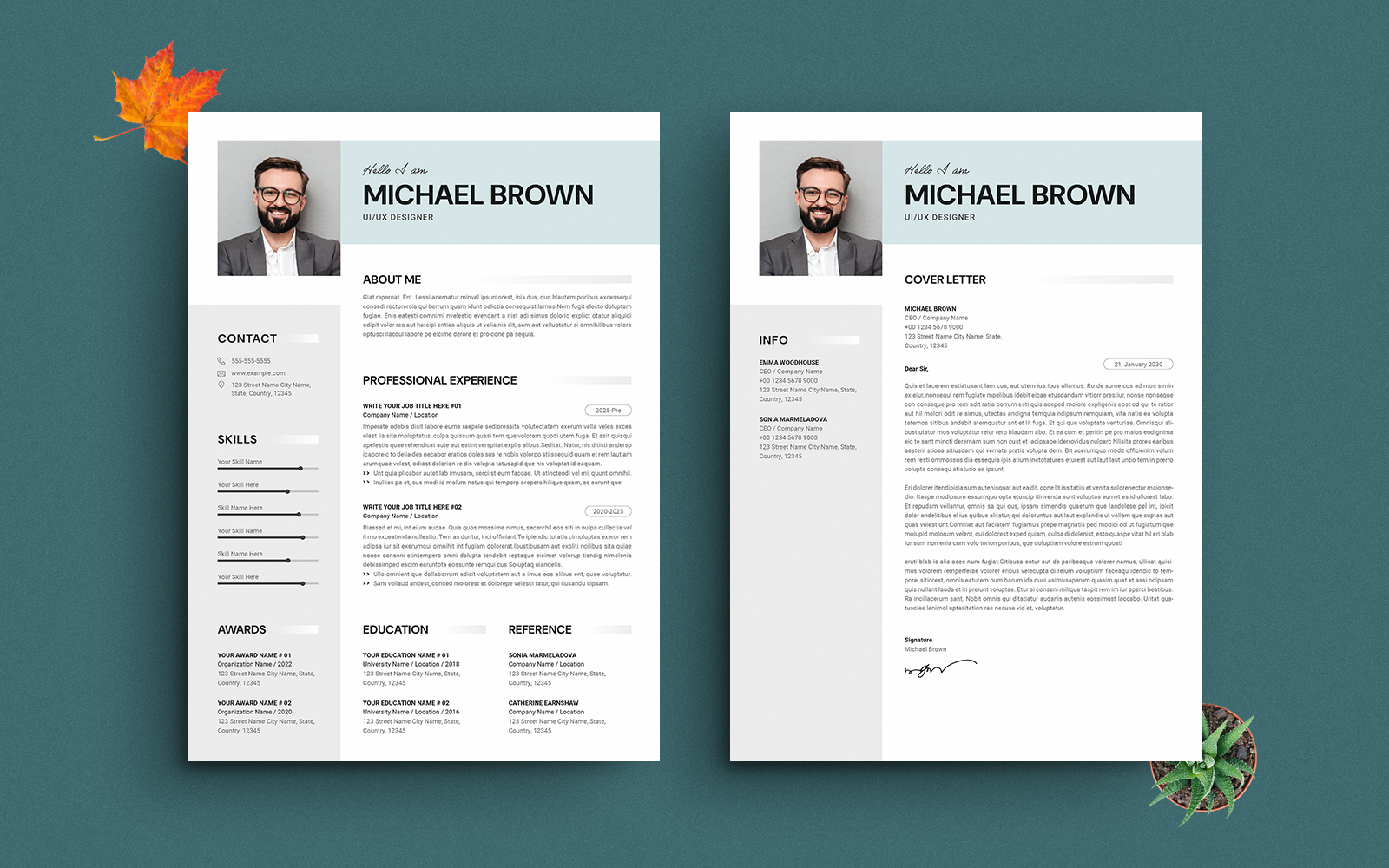 Download this clean and modern Resume CV Template with matching Cover Letter. Fully editable in Word/AI/PSD, designed for professionals to stand out with a creative yet minimal layout. Perfect for designers, marketers, and job seekers.