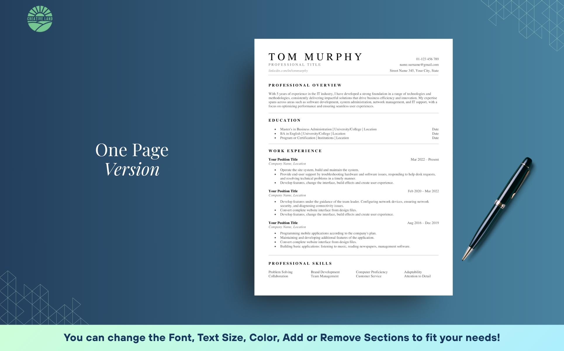 Let CreativeLandStudio on help you get noticed by employers and a standout resume is the key to unlocking that job. Explore our templates today and make sure you're sending out a resume that truly showcases the value you bring.