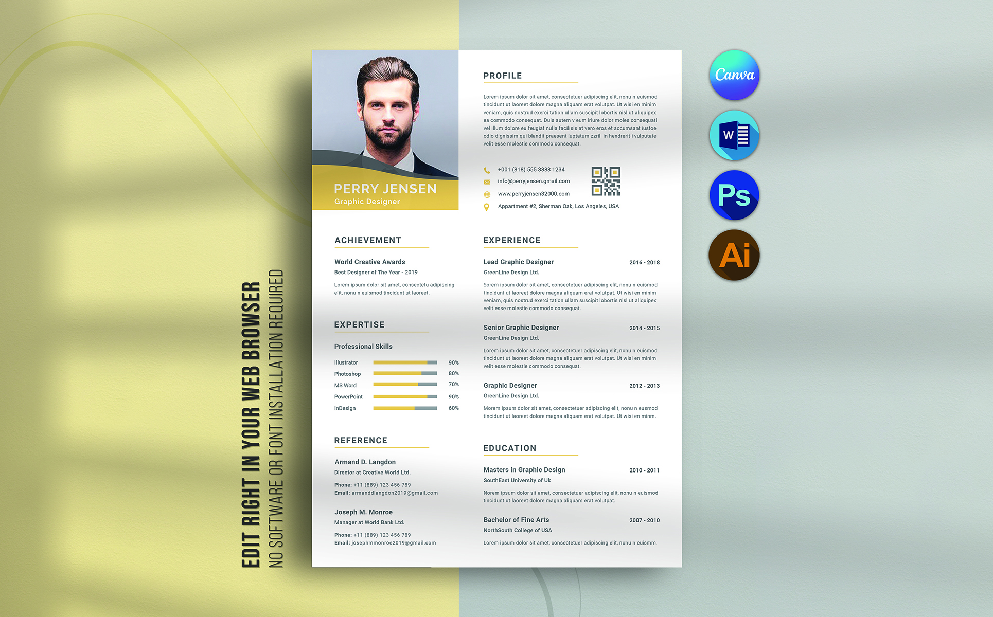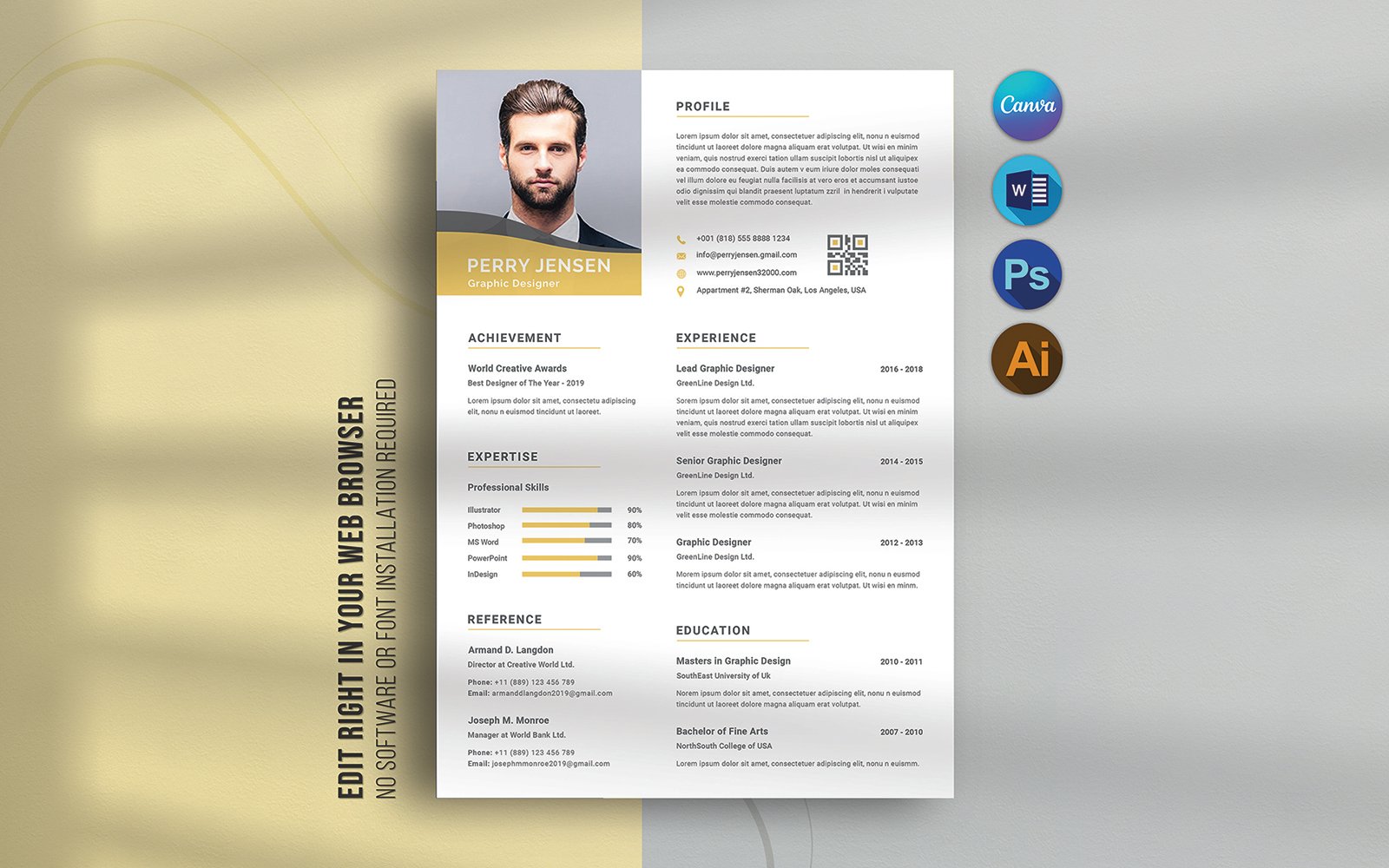 Stand out from the crowd with this modern, professional resume template — perfect for job seekers, career professionals, and students. Designed with clean typography, elegant structure, and smart sections, this resume ensures your information is easy to read and visually impressive to recruiters. This template works seamlessly in Canva, Microsoft Word, Adobe Photoshop, and Illustrator, making it simple for you to edit, personalize, and print — no design experience needed!