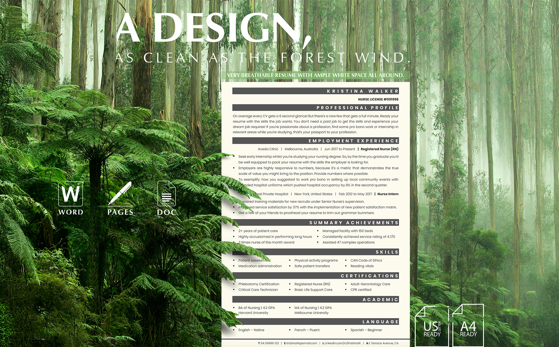 This ATS-Friendly Nurse Resume Template is designed specifically for Registered Nurses, New Grad Nurses, and healthcare professionals. Compatible with Microsoft Word (2016+ Desktop), Google Docs, and Mac Pages, this resume template helps you present your credentials clearly and professionally—no design skills needed.