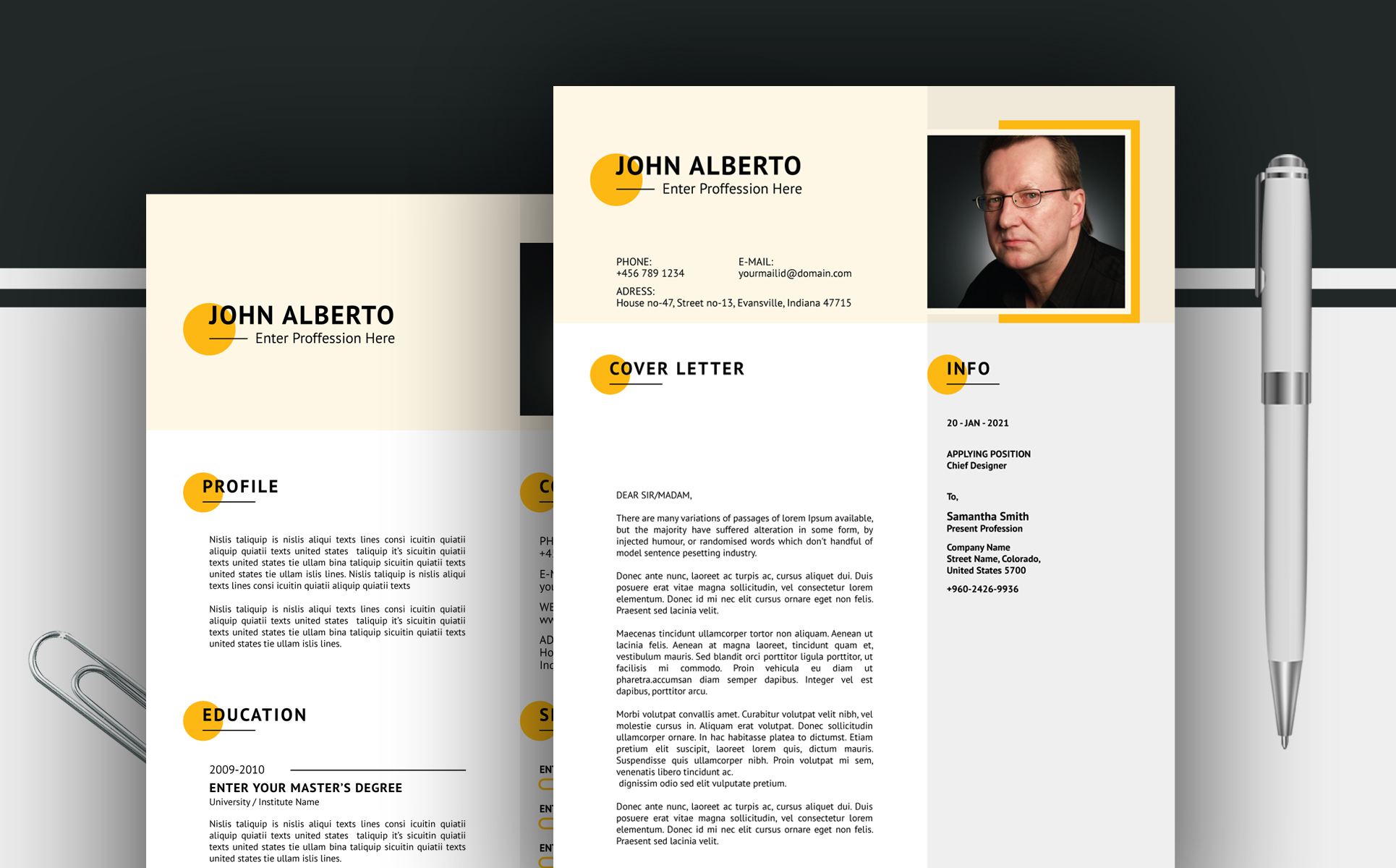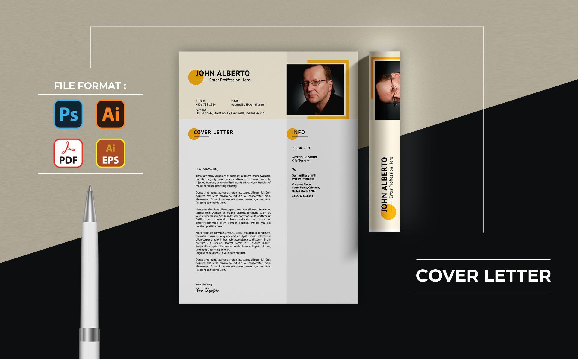 This is a free professional CV template with a cover letter for the job. Print Ready with 100% editable file. It’s designed by Adobe Illustrator and Adobe Photoshop. This is a CV format resume template setup with CMYK, Layered, 300 dpi, bleeds & safe guides, trims and free font. Template specification format a4 size 210x297 mm print dimension. It's a fully professional CV format with a cover letter for the job. Thank you & hope you will enjoy it!