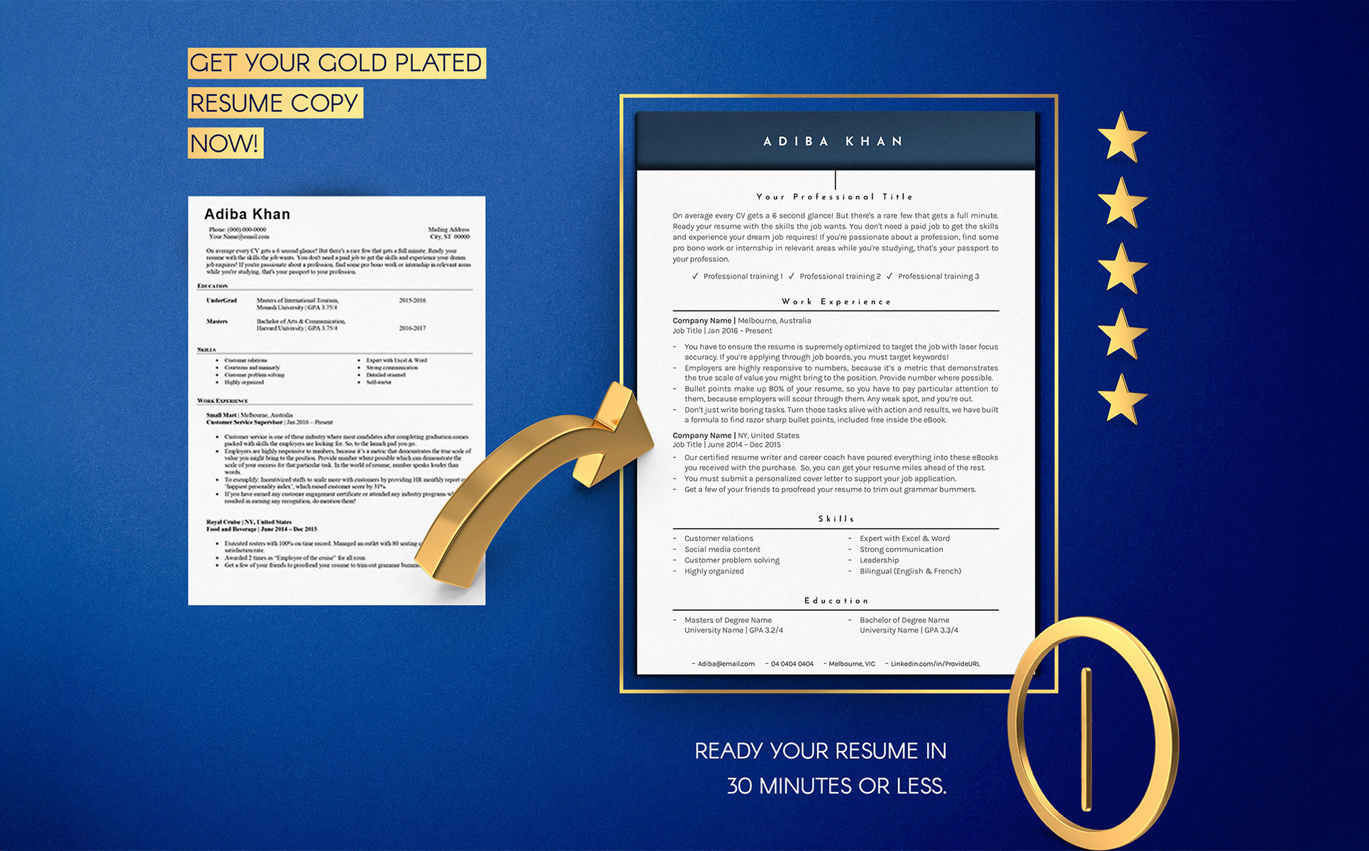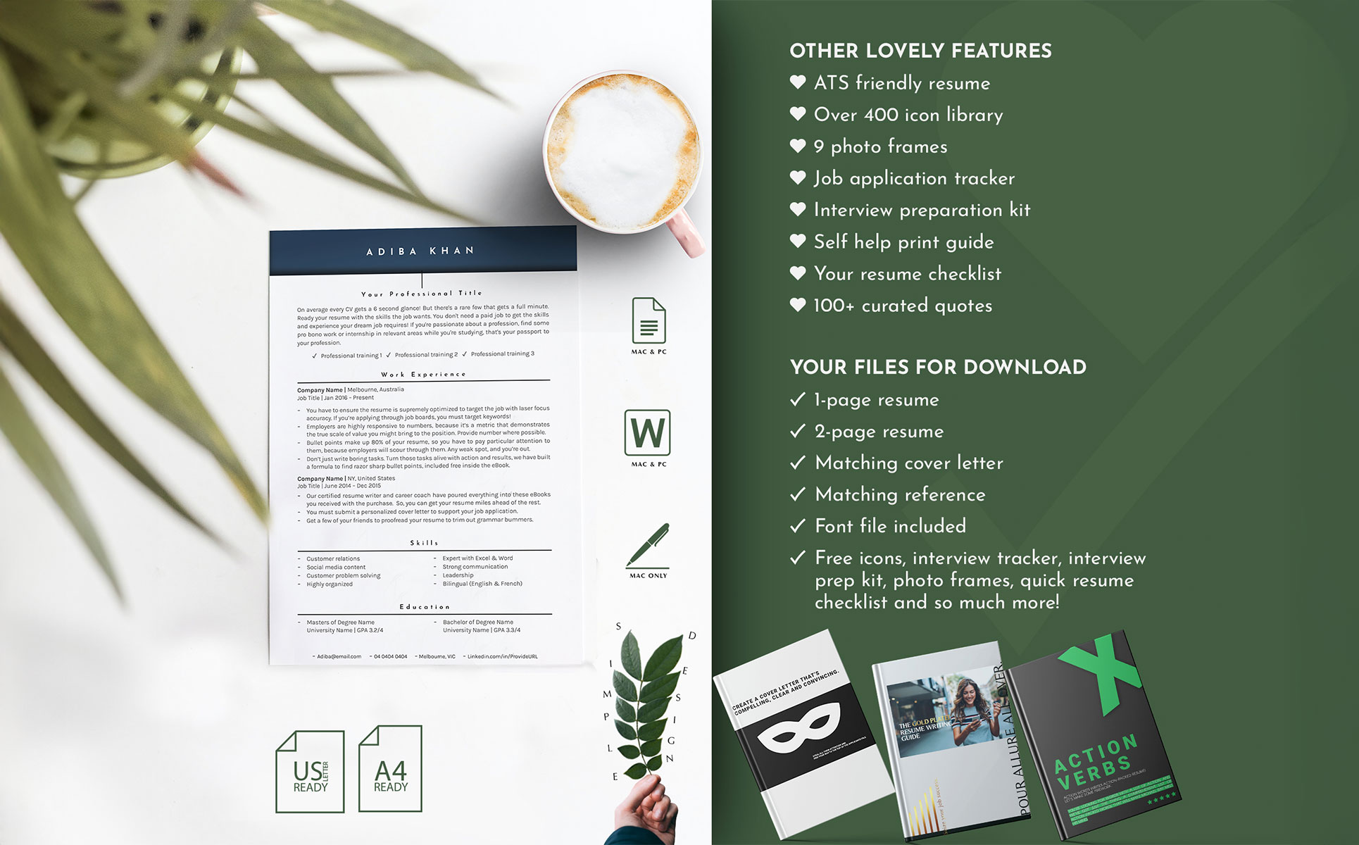 But here’s the kicker - we’re not just offering templates. You’ll also get the font file, an exclusive resume writing eBook, a comprehensive action verbs eBook, and a cover letter eBook that will add a sprinkle of stardust to your application. And as if that’s not enough, we’re tossing in some awesome freebies: icons, an interview tracker, an interview prep kit, photo frames, and a quick resume checklist.
