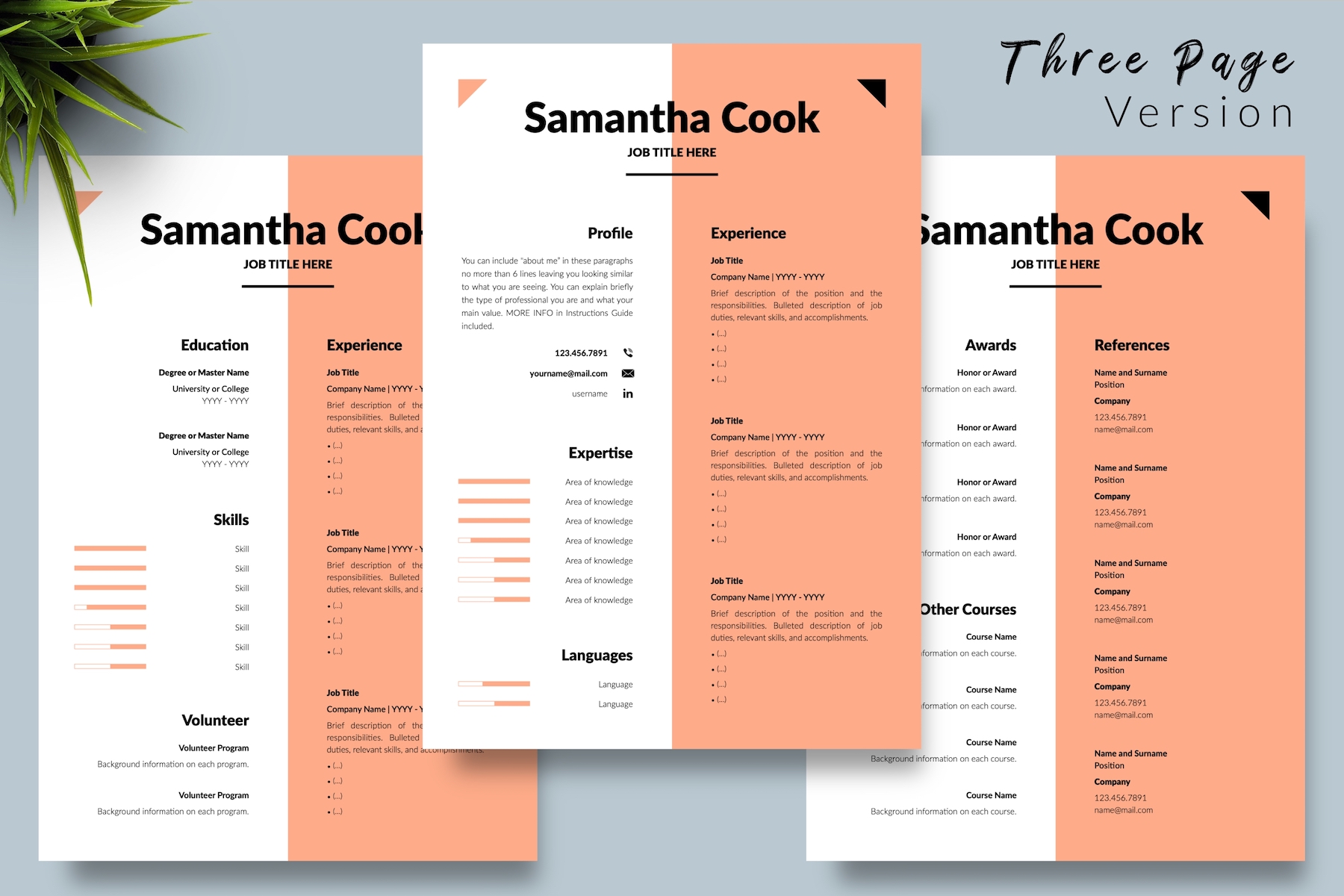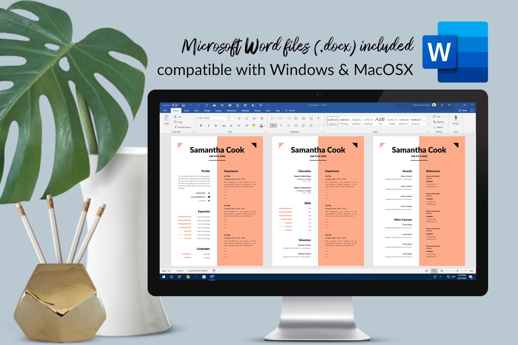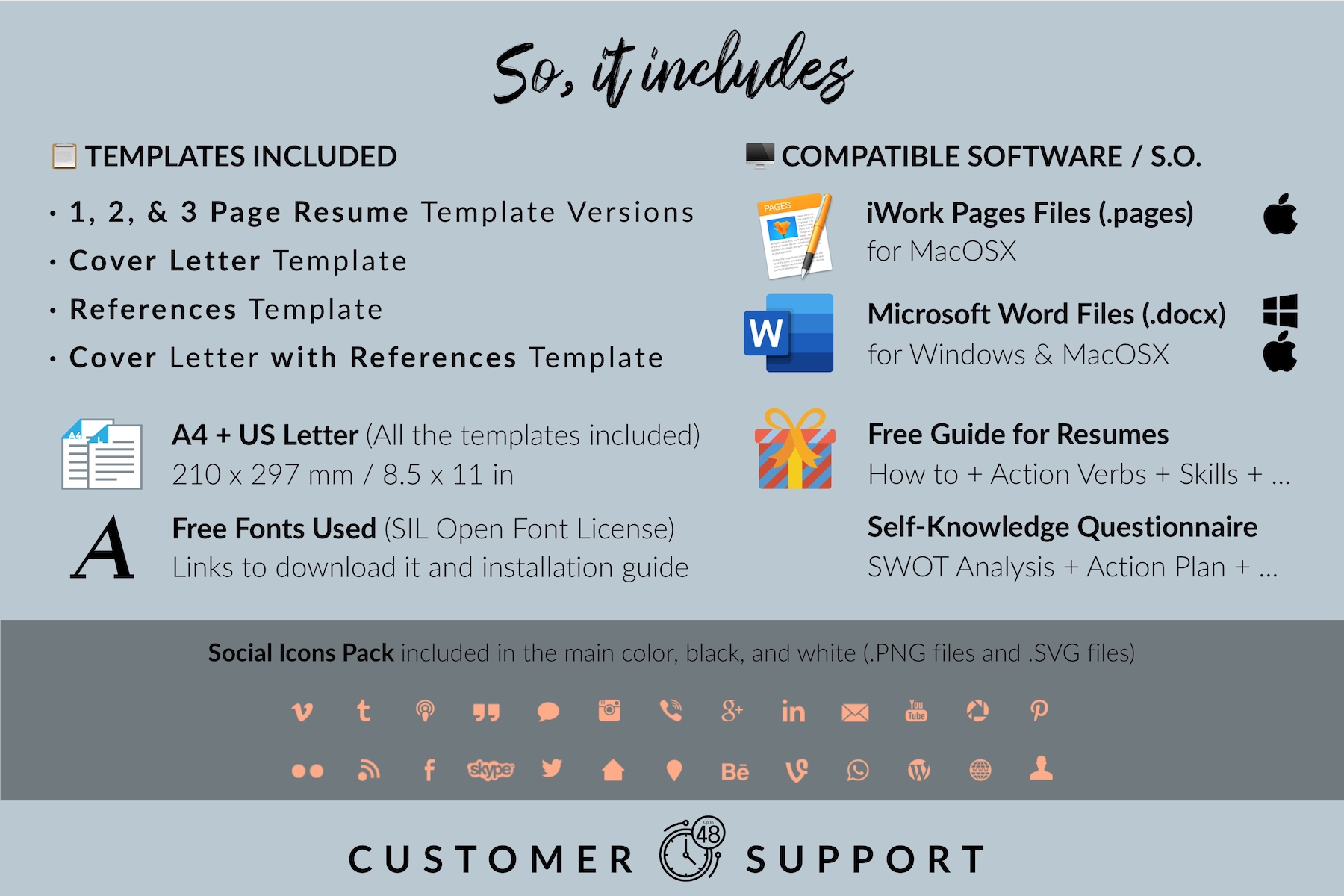 Resume/CV Template for Microsoft Word & iWork Pages that includes US Letter Size Files and A4 Size Files; Microsoft Word Files (.docx) and iWork Pages Files (.pages); 1, 2, and 3 Page Resume Version, Cover Letter Template, References Letter Template, and Cover Letter with References Letter Template. In addition, it includes Free Fonts Used (SIL Open Font), Social Icons Pack, Resume Writing Guide for Resume Building (Free Bonus), and Self-Knowledge and Development Questionnaire (Free Bonus).