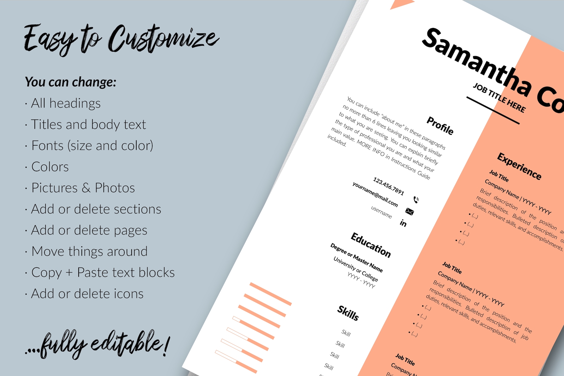Templates are fully editable 100%. Easy to edit/customize resume templates with Microsoft Word for Windows and MacOS (.docx) and iWork Pages for MacOS (.pages). Each element on the resume template has been designed in separate text boxes so that it can be easily moved, copied, or removed. Simply click on the text and start typing over my draft text. Templates are do-it-yourself. You can change: