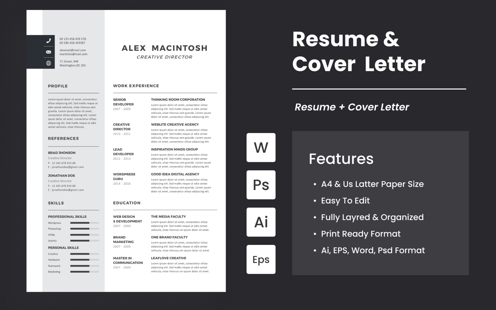 This is Resume & Cover Letter template . This template download contains 300 dpi print-ready CMYK files. All main elements are editable and customizable.