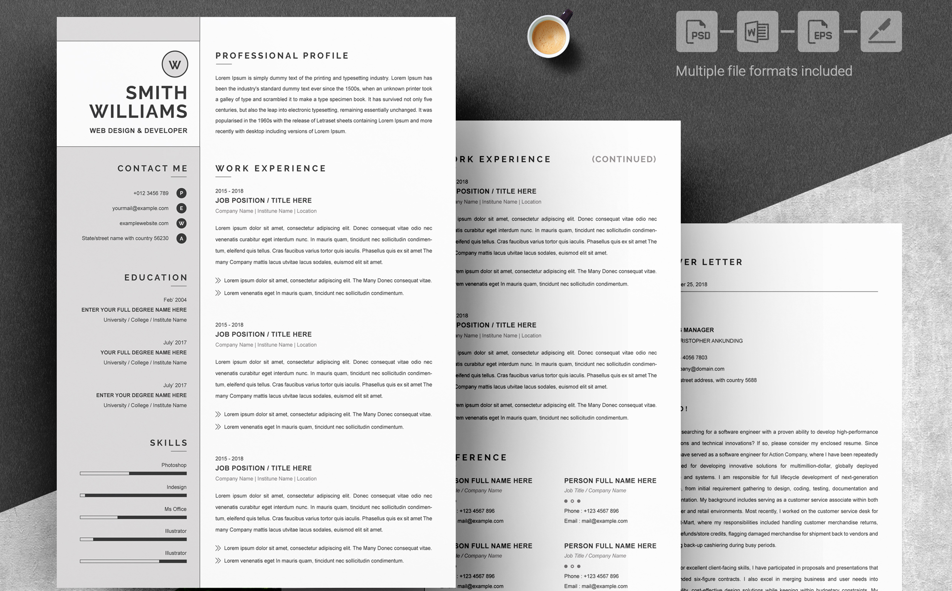 A template is simply multiple file-formats Microsoft Word document (or Mac Pages document, Photoshop (PSD) Illustrator (EPS) that is formatted using "text boxes" filled with my "dummy" information that you will type directly over with your own resume info. A quick text box tutorial is included in the Instructions file, included with purchase.