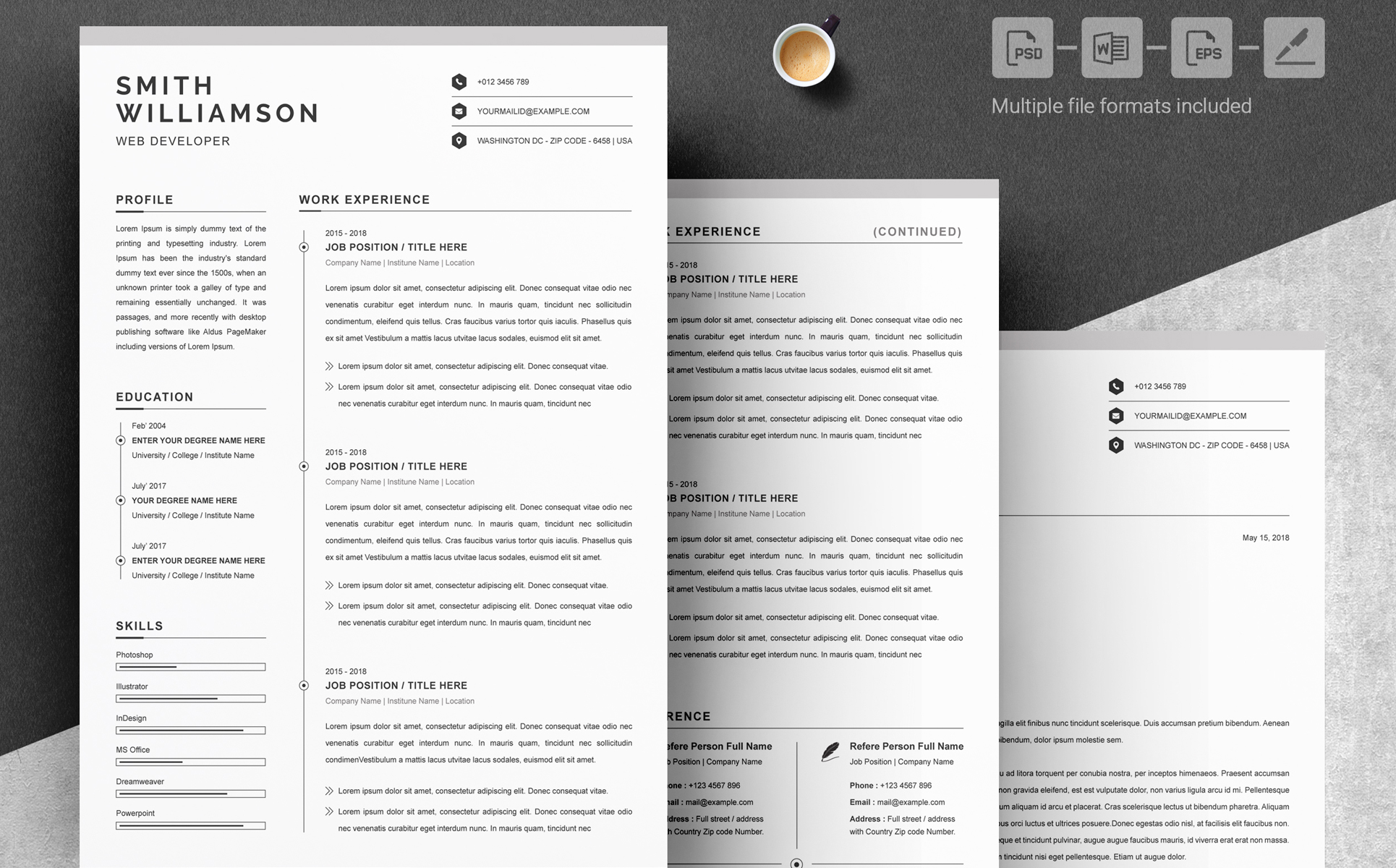 A template is simply multiple file-formats Microsoft Word document (or Mac Pages document, Photoshop (PSD) Illustrator (EPS) that is formatted using "text boxes" filled with my "dummy" information that you will type directly over with your own resume info. A quick text box tutorial is included in the Instructions file, included with purchase.