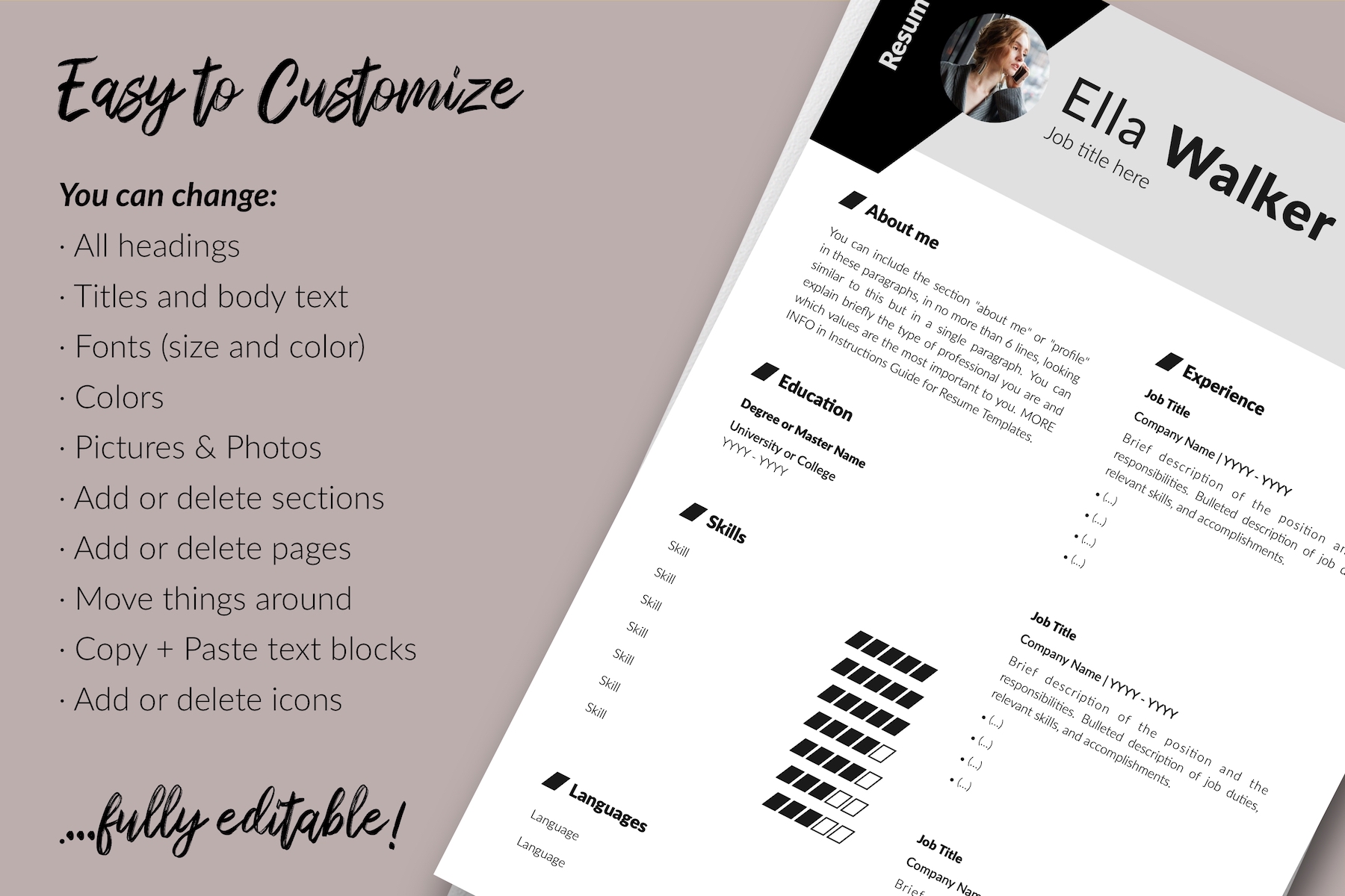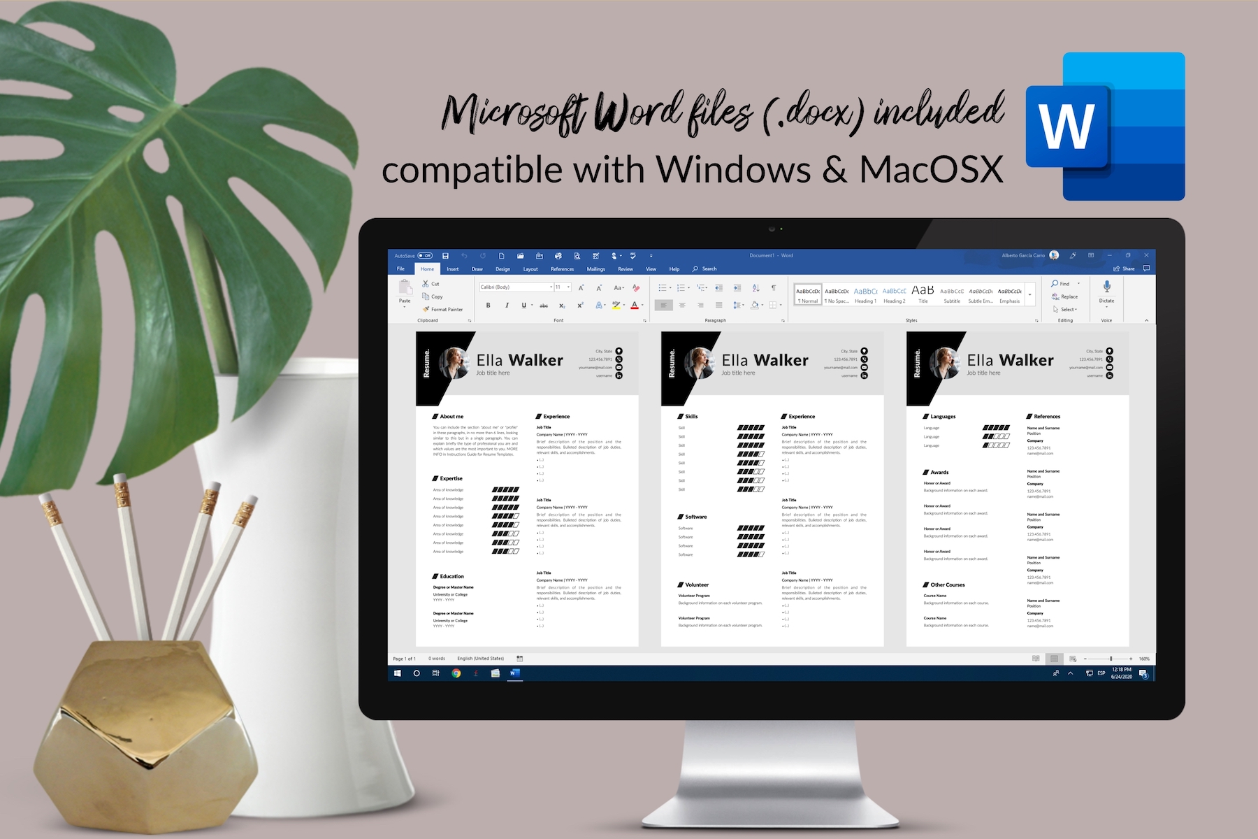 Templates are fully editable 100%. Easy to edit/customize resume templates with Microsoft Word for Windows and MacOS (.docx) and iWork Pages for MacOS (.pages). Each element on the resume template has been designed in separate text boxes so that it can be easily moved, copied, or removed. Simply click on the text and start typing over my draft text. Templates are do-it-yourself. You can change: