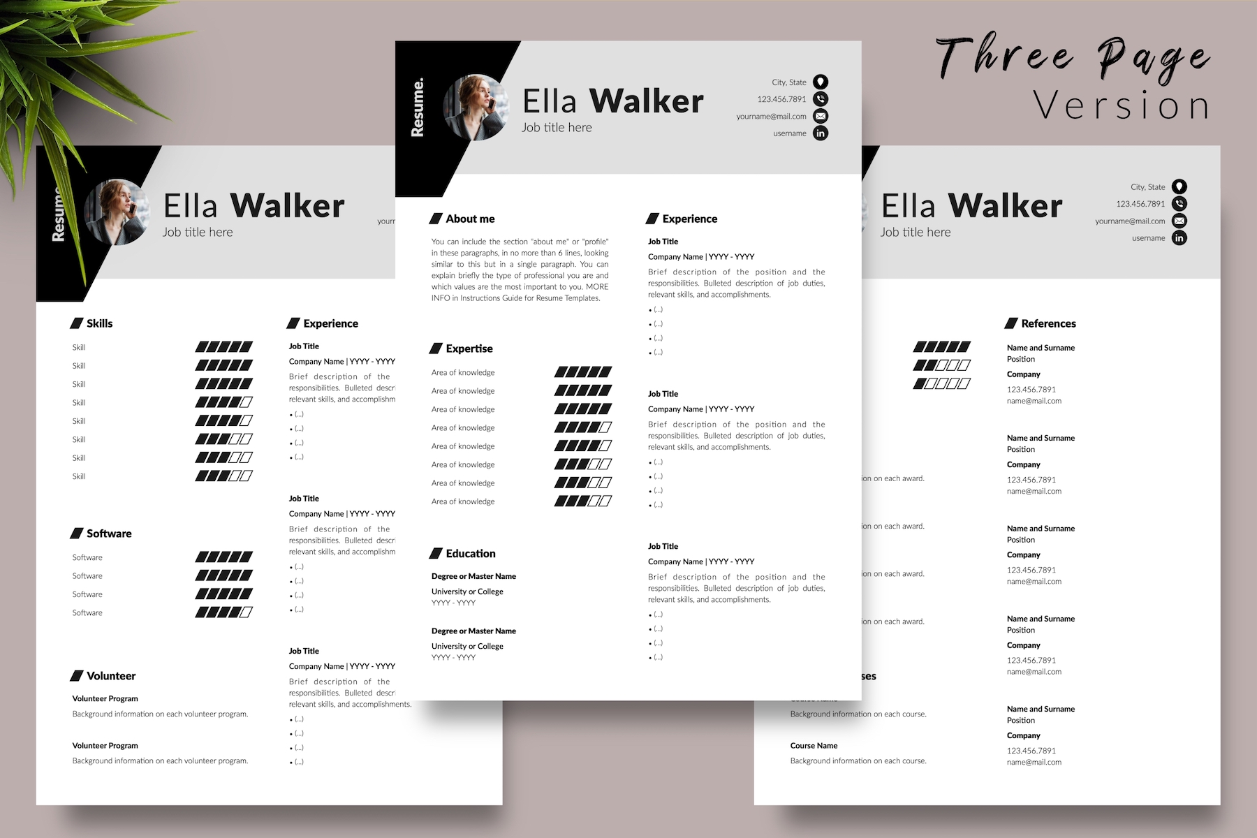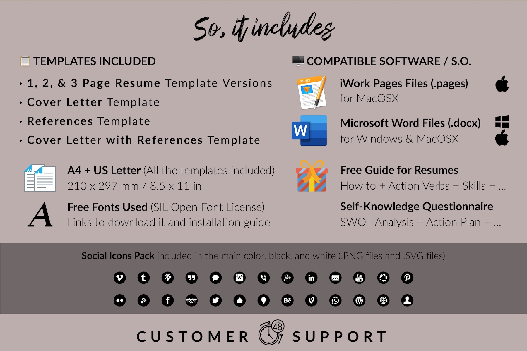 Resume/CV Template for Microsoft Word & iWork Pages that includes US Letter Size Files and A4 Size Files; Microsoft Word Files (.docx) and iWork Pages Files (.pages); 1, 2, and 3 Page Resume Version, Cover Letter Template, References Letter Template, and Cover Letter with References Letter Template. In addition, it includes Free Fonts Used (SIL Open Font), Social Icons Pack, Resume Writing Guide for Resume Building (Free Bonus), and Self-Knowledge and Development Questionnaire (Free Bonus).
