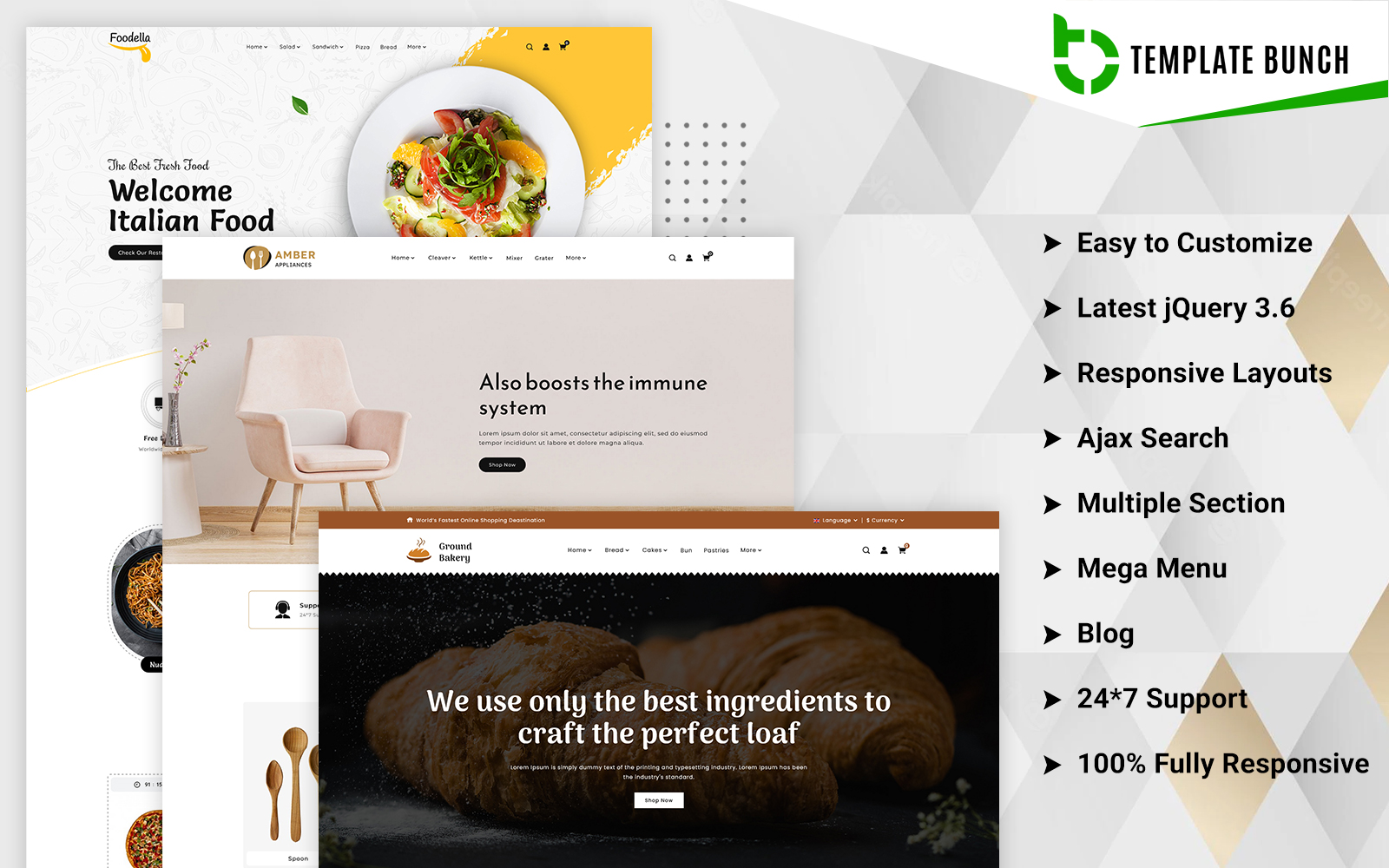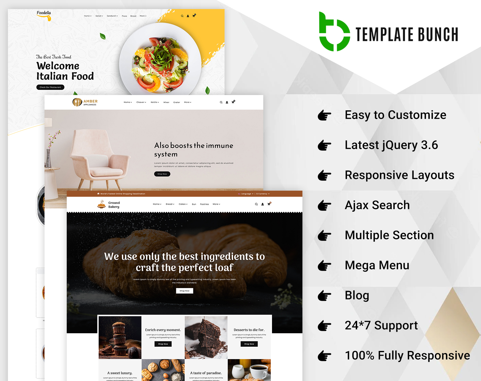 Amber - Home and Bakery with Food - Responsive Shopify 2.0 Ecommerce theme can be used for home stuff, bakery and food products. This Shopify theme is built for excellence, featuring a live customizer powered by the Redux framework for unparalleled flexibility. With a one-click import feature and unlimited customization options, setting up your store is quick and easy. Built on the latest Bootstrap framework, this theme is 100% responsive, ensuring flawless performance on all devices. It includes a functional contact form with Ajax for easy communication, and its minimal and clean design offers a modern, elegant aesthetic. Enhanced with content icons, this theme is easy to customize and offers a unique look that will make your e-commerce store stand out.