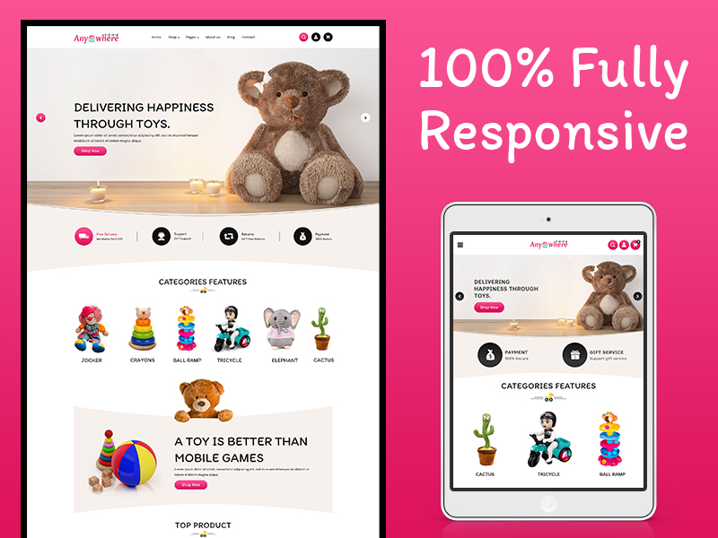 With 24/7 support, you’ll always have assistance whenever you need it. Whether you're selling toys, educational games, or children's accessories, Anywhere - Toys eCommerce Themes and Templates on Shopify is the perfect choice for building a bright, engaging, and high-performing online store. ?