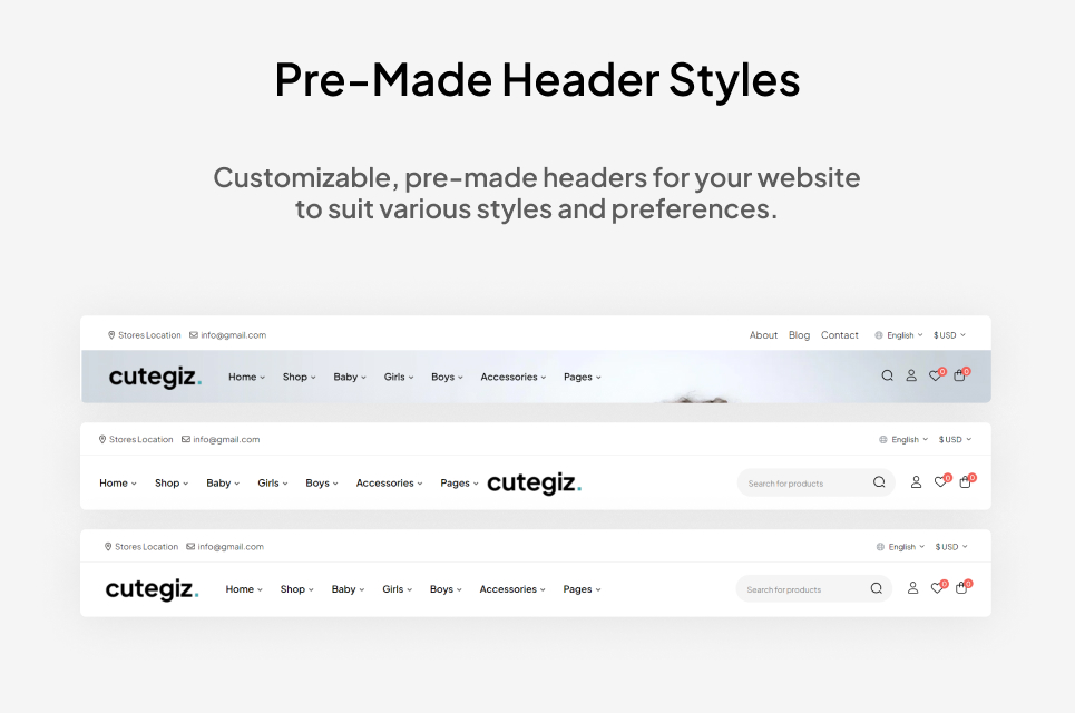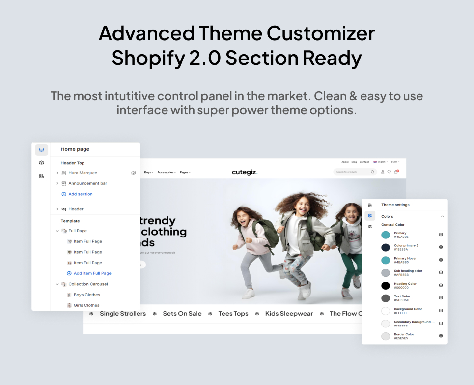 Built on the user-friendly Shopify 2.0 section-ready platform, Ap Cutegiz is easy to customize, making it suitable for both beginners and experienced webmasters. This theme is ideal for a wide range of businesses, including kids shops, kid stores, kids fashion stores, kids clothing, kids toy stores, kids brands, stroller shops, baby shops, baby accessory shops, fashion stores, and more. With Ap Cutegiz - Kids Fashion Shopify Theme, you can effortlessly create a stylish, responsive, and customer-friendly online store that stands out in the competitive market.