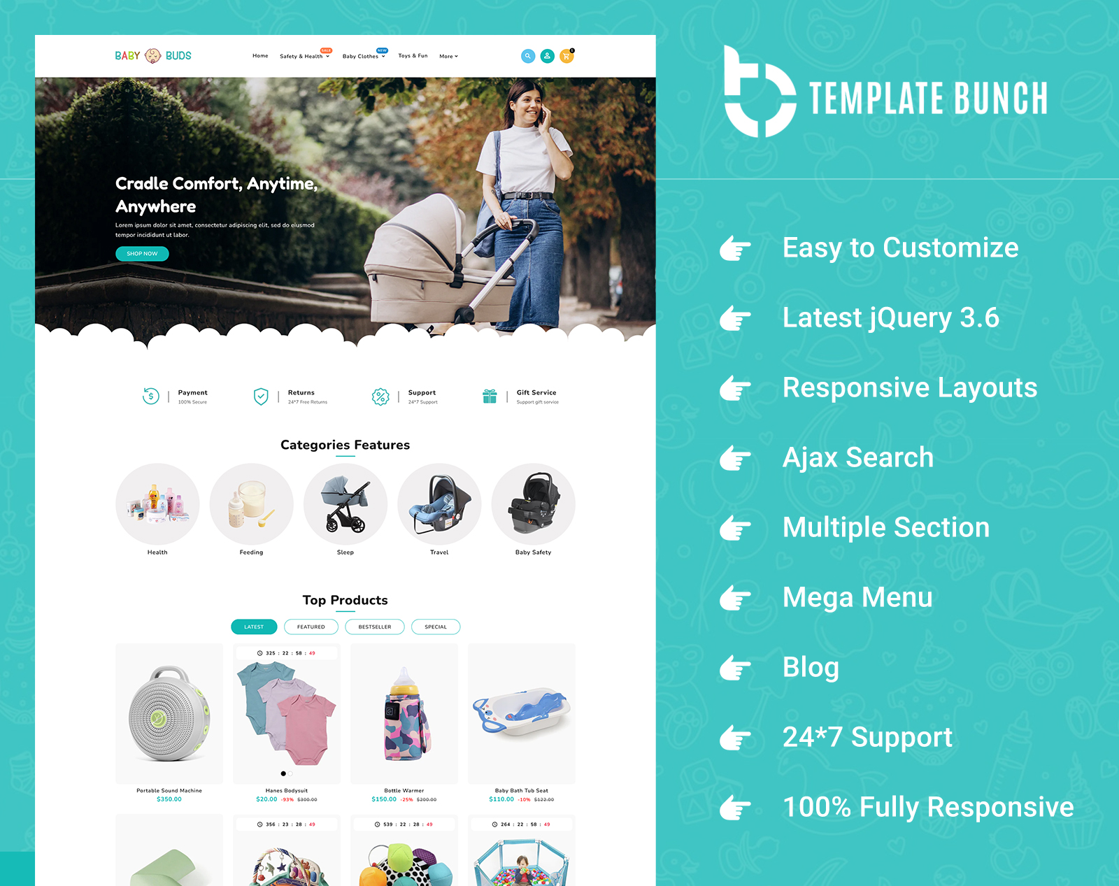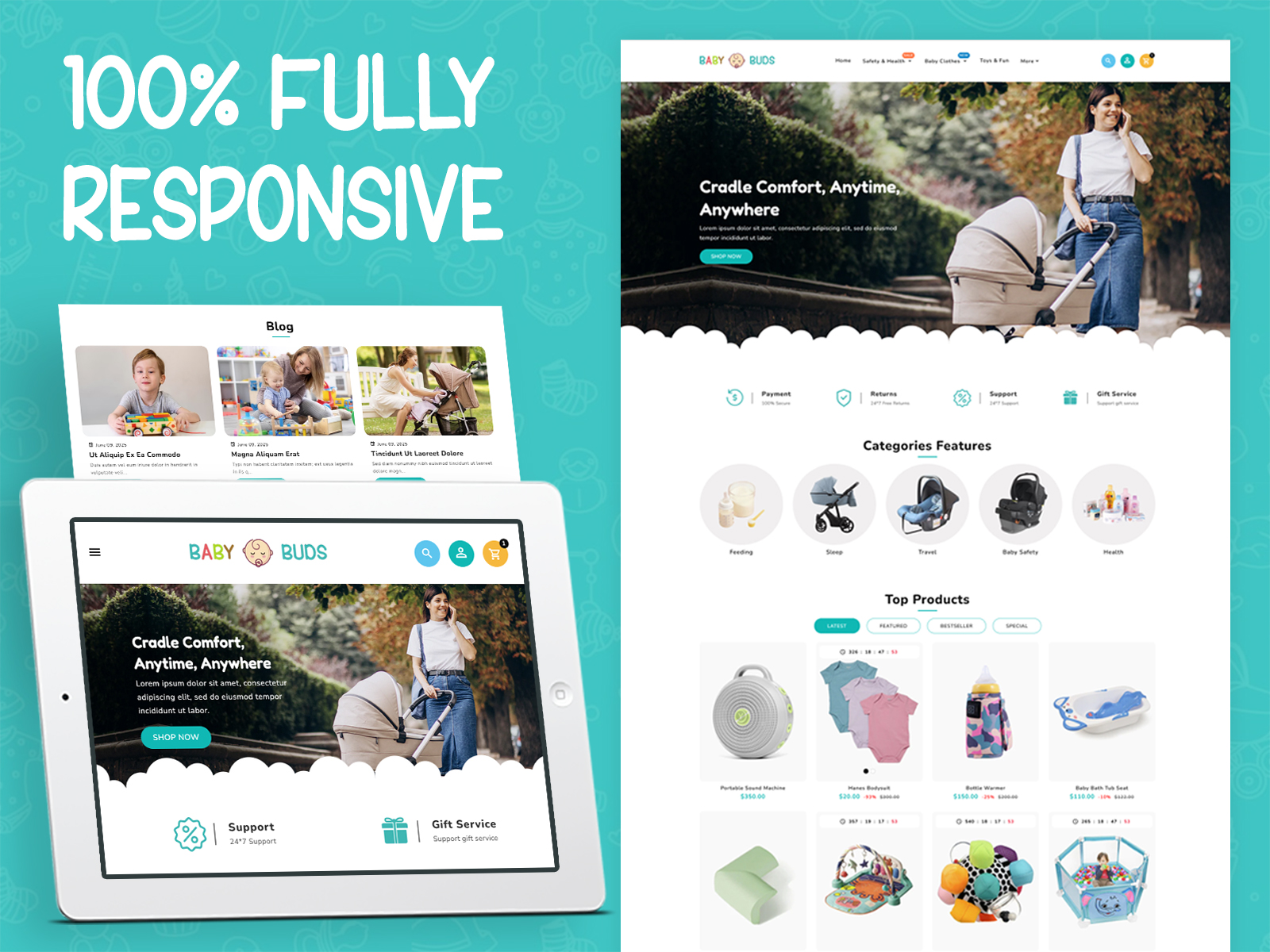 Baby Buds - Responsive Shopify Theme for eCommerce is a soft, cheerful, and highly functional theme tailored for baby products, kids’ clothing, toys, and maternity stores. Built on the powerful Bootstrap framework and integrated with the Redux framework, this theme makes customization effortless with its intuitive Live Customizer, One Click Import, and unlimited options for design flexibility.