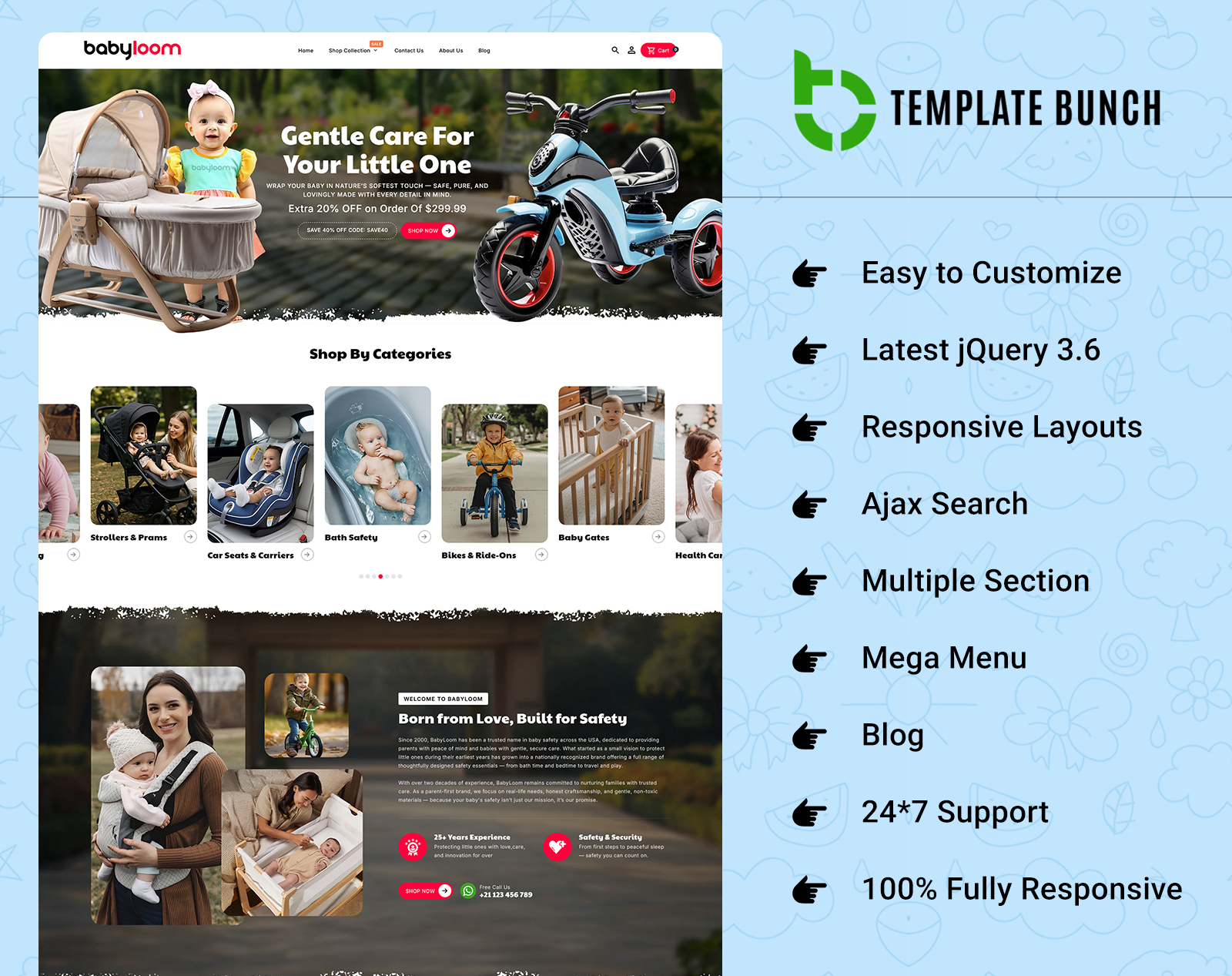 Baby Loom comes with ready-to-use homepage layouts, well-commented code, and clear documentation, making customization easy for beginners and developers alike. Plus, with cross-browser compatibility, free lifetime updates, and 24/7 support, your store stays fresh, functional, and future-ready.
