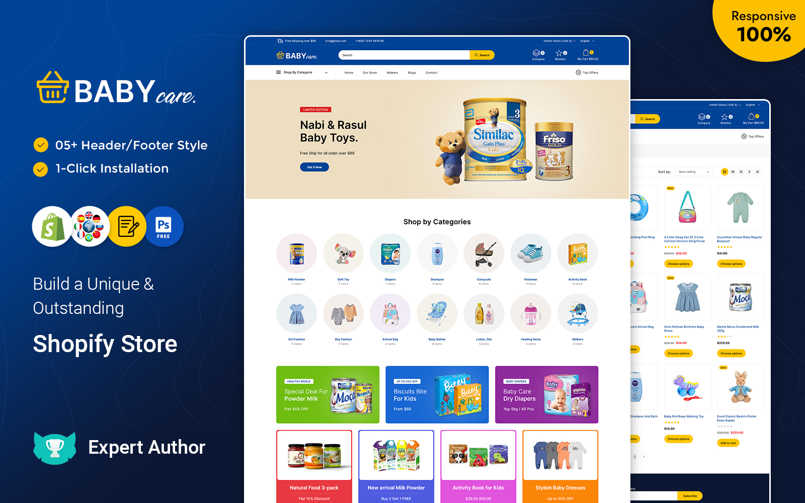 Children's Shop at BabyCare The Shopify theme is clean, responsive, and ideal for children's clothing, organic food, groceries, fashion, technology, gadgets, sneakers, shoes, and furniture. It also enables you to create various structures and fulfill any specific requirements for various types of businesses. dependable, adaptable, and easy to utilize Baby care is best described by these phrases. You can still easily create a website even if you have no programming experience.