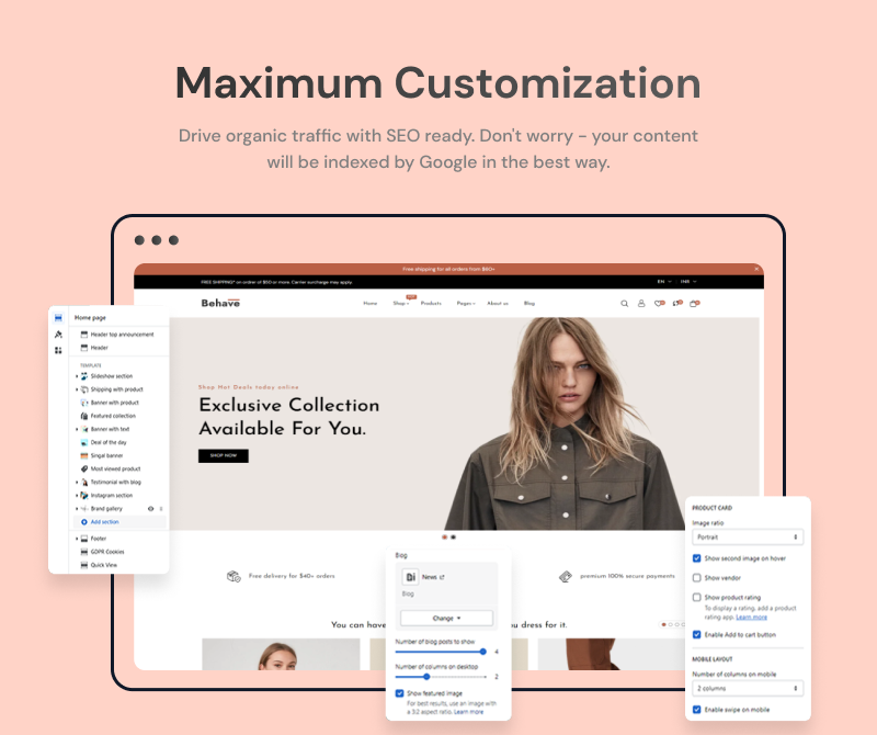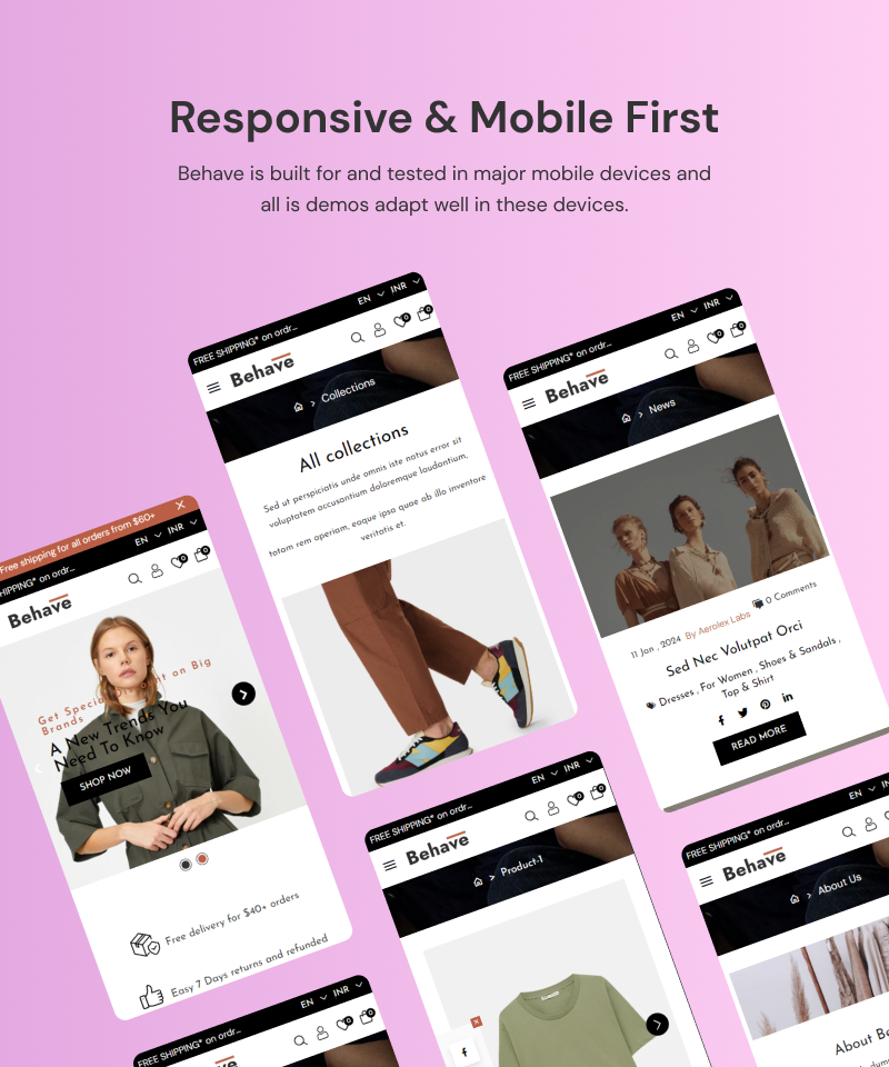 "Behave - Fashion" is a high-level, multi-purpose responsive Shopify 2.0 theme specifically designed for fashion and accessory stores. It features a fully responsive design optimized for seamless performance across all devices, ensuring a consistent and engaging shopping experience. Built on the latest Shopify 2.0 framework, it offers superior performance and flexibility with section-based editing, faster loading times, and enhanced customization. With versatile layouts suitable for various fashion niches, it provides multiple homepage designs and a variety of inner page templates. The theme includes advanced customization options through a drag-and-drop builder, extensive settings for colors, fonts, and layouts, and is built with SEO best practices to improve search rankings. High-resolution images, retina-ready graphics, and features like quick view, wish lists, and product filters enhance the visual appeal and user experience. Comprehensive documentation and a dedicated support team ensure smooth setup and customization.