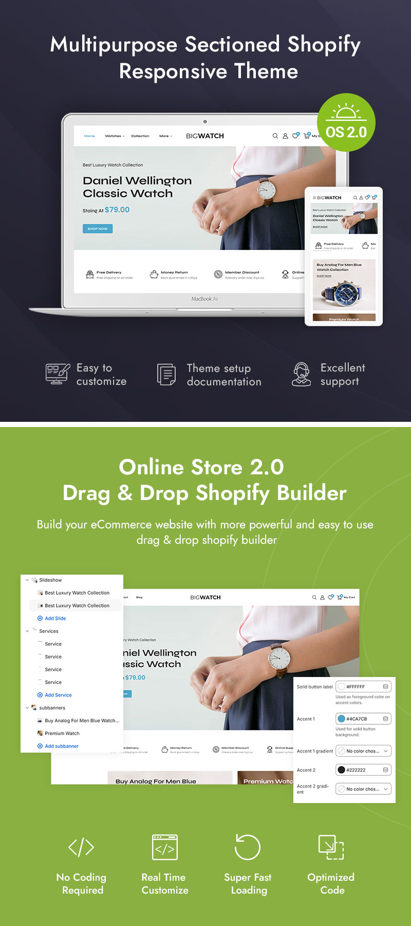 BigWatch features a clean, minimalistic, and luxury-inspired design, making it the perfect choice for high-end watch and accessory retailers. With typography, elegant product displays, and smooth navigation, your store will leave a lasting impression on customers. Leveraging the latest Shopify 2.0 technology, this theme provides drag-and-drop sections, improved theme customization options, and a robust performance for faster loading speeds. Easily create unique layouts and modify sections without coding knowledge.