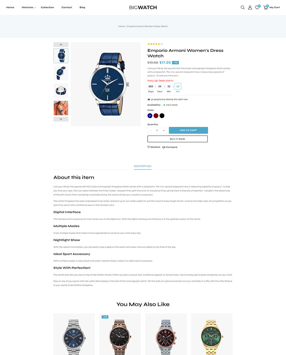 BigWatch is a premium Shopify 2.0 responsive theme designed specifically for online stores selling watches, luxury timepieces, smartwatches, fashion accessories, and jewelry. With its modern, elegant, and fully customizable design, this theme provides a seamless shopping experience for customers while offering merchants an easy-to-manage storefront.